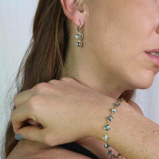 14k Multi Shade Blue Topaz 3 Station Paperclip Adjustable Bracelet