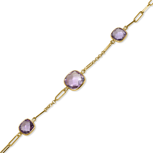 14k Amethyst Cushion Station Paperclip Bracelet