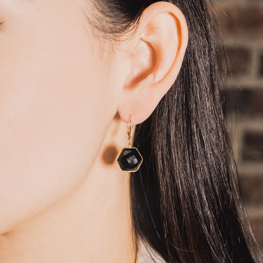 14k Yellow Gold Black Onyx Hexagon Leverback Earring