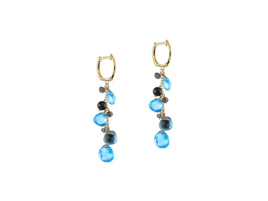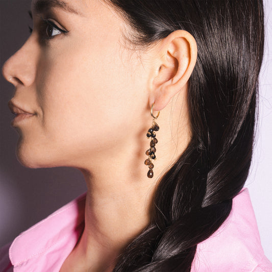 14k Smoky Quartz and Black Onyx Cluster Huggie Hoop Dangle Earring