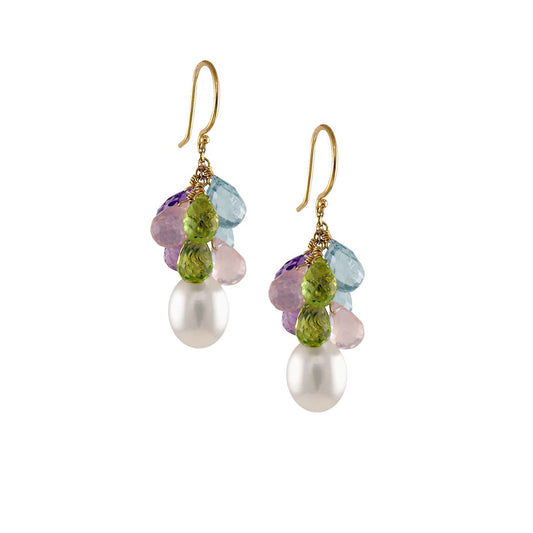 14k White Freshwater Pearls, Gemstones Hook Earring