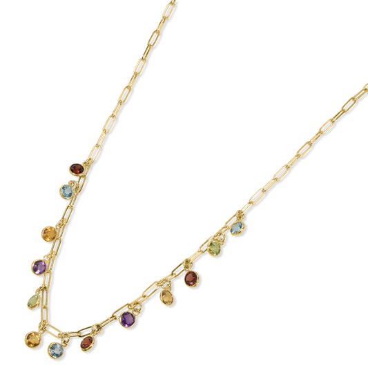 14k Multi Gemstone 13 Round Bezel Paperclip Necklace