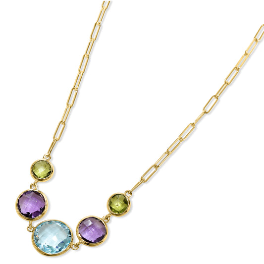 14k Multi Gemstone 5 Round Bezel Paperclip Necklace