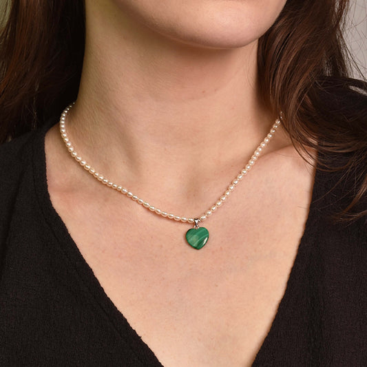 Sterling Silver White Freshwater Pearl Green Malachite Heart Pendant Necklace