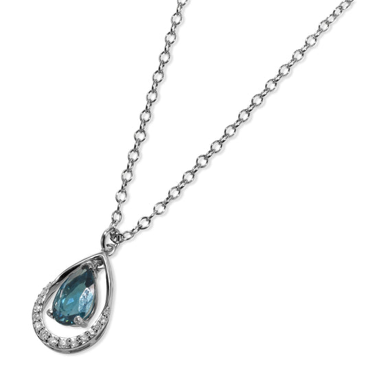 14k White Gold London Blue Topaz Diamond Pear Shape Pendant Necklace