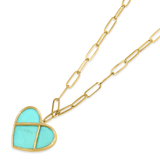 14k Turquoise Heart Pendant Paperclip Chain Necklace