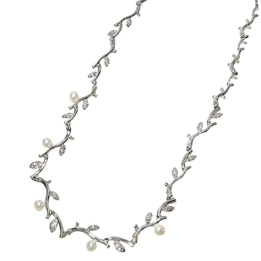 14k White Gold Fresh Water Pearl Diamond Leaf Branch Necklace