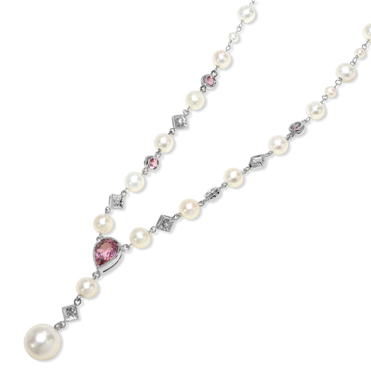 14k White Gold Diamond Pink Tourmaline Fresh Water Pearl Y Necklace