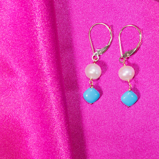14k White Pearl, Turquoise Flat Diamond Leverback Earring