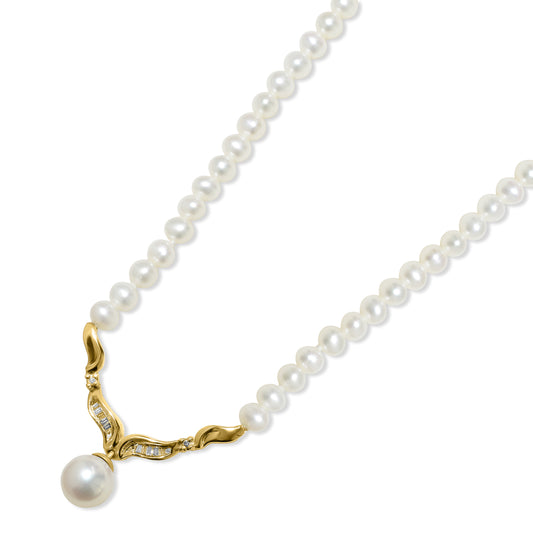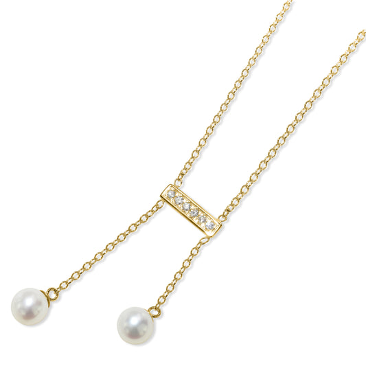 14k White Pearl V Shape Diamond Bar 2 Row Pendant Necklace