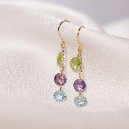 14k Peridot, Amethyst, Blue Topaz Triple Coin Hook Earring