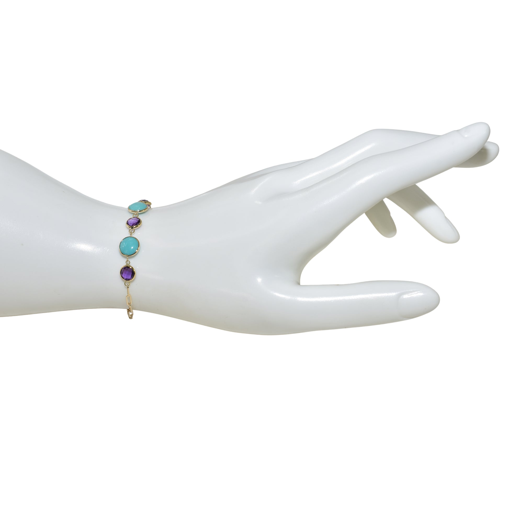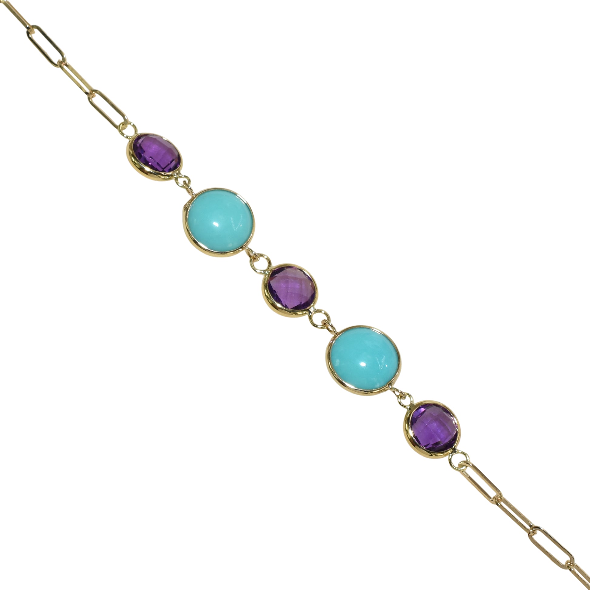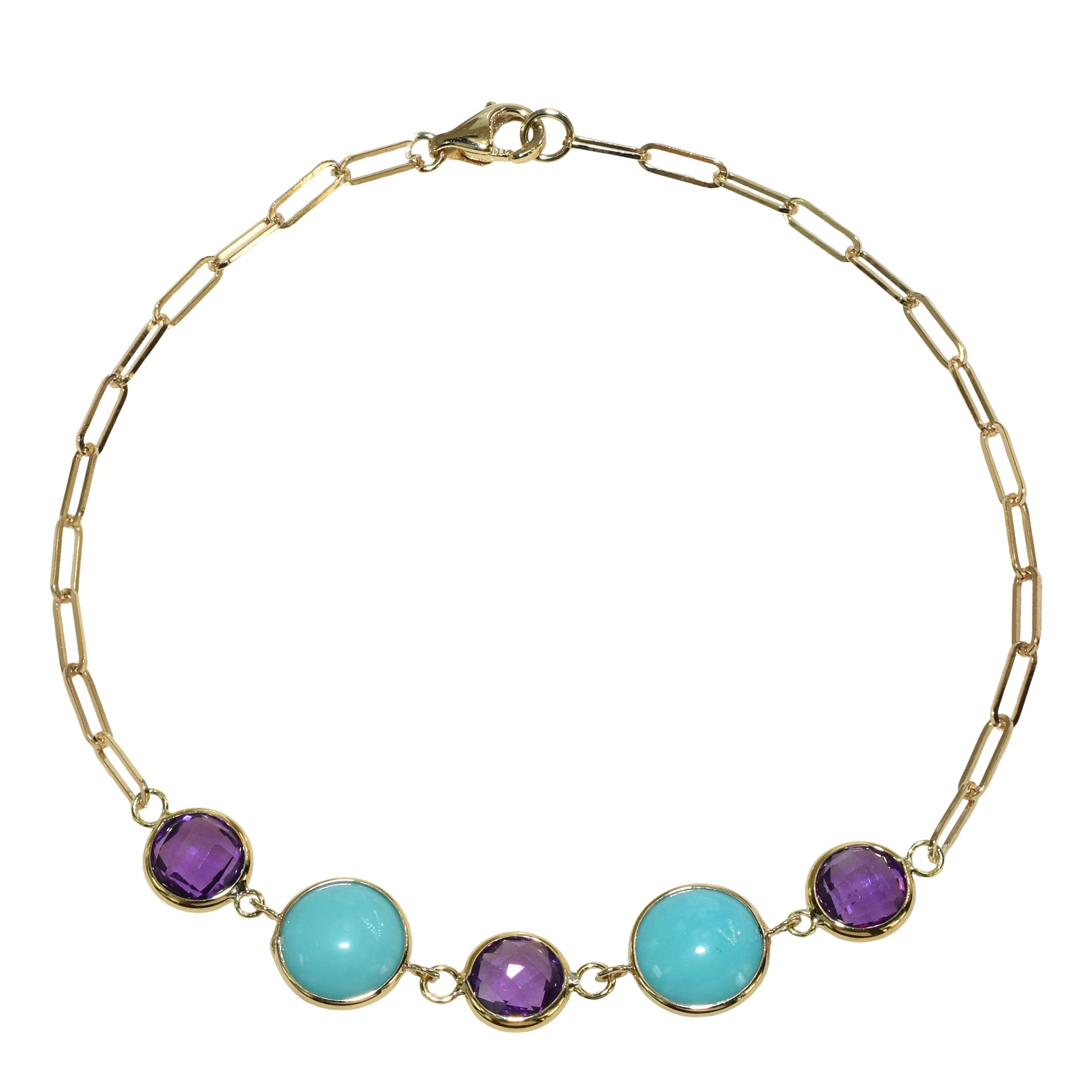 Elevate your style with this stunning 14k gold bracelet featuring five uniquely linked pieces adorned with vibrant African amethyst and turquoise stones. Its sleek paperclip design offers a modern, elegant touch while the rich colors of the gemstones bring a captivating, natural beauty. Perfect for adding a subtle statement to any outfit, this bracelet combines durability with refined artistry for everyday wear or special occasions. Embrace timeless sophistication with this exquisite accessory.