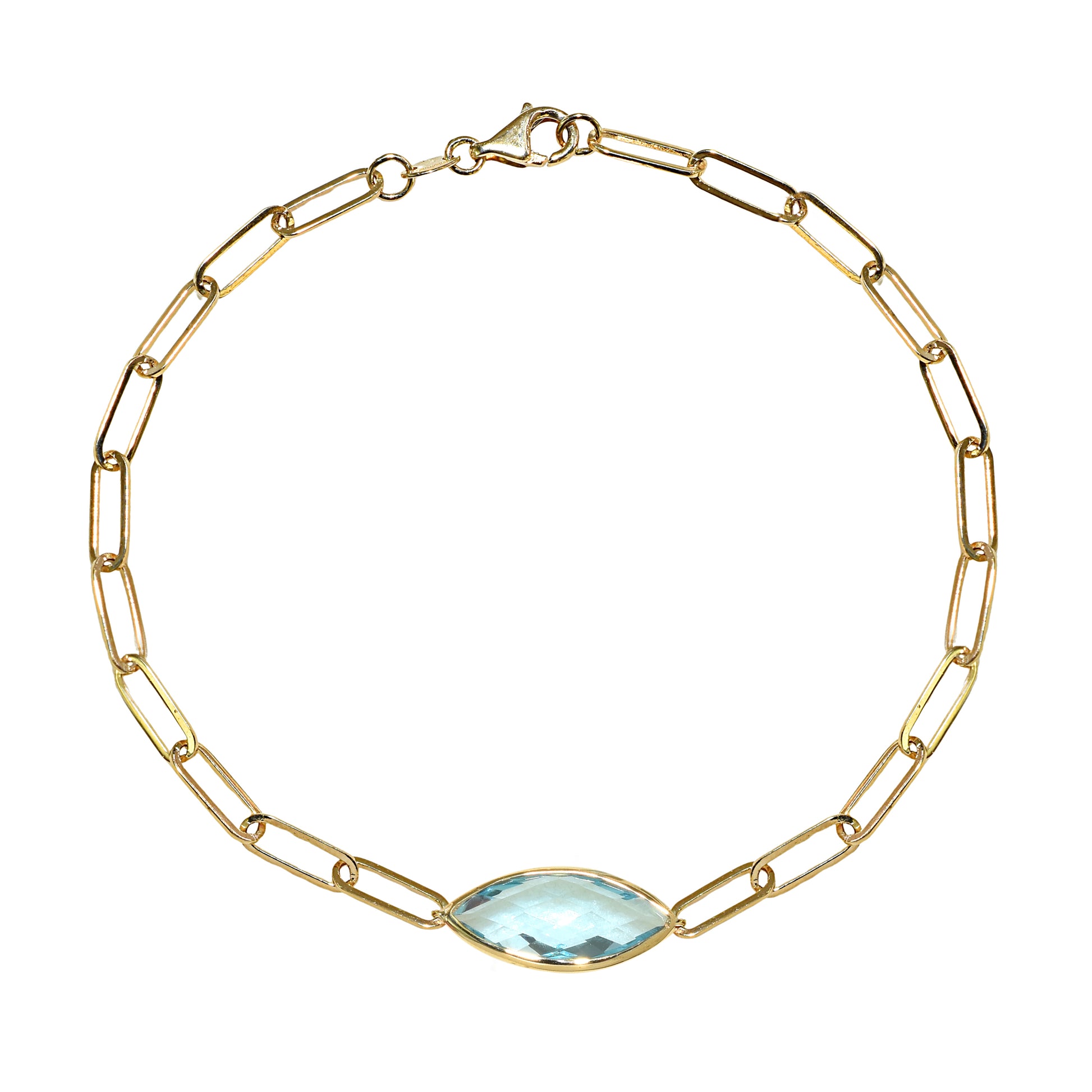 This elegant 14k gold paperclip bracelet features a stunning marquise-cut blue topaz centerpiece, adding a vibrant touch of color and sophistication to your wrist. Its unique design blends modern style with timeless charm, making it perfect for both everyday wear and special occasions. Crafted for durability and comfort, this bracelet elevates any outfit with a refined sparkle.
