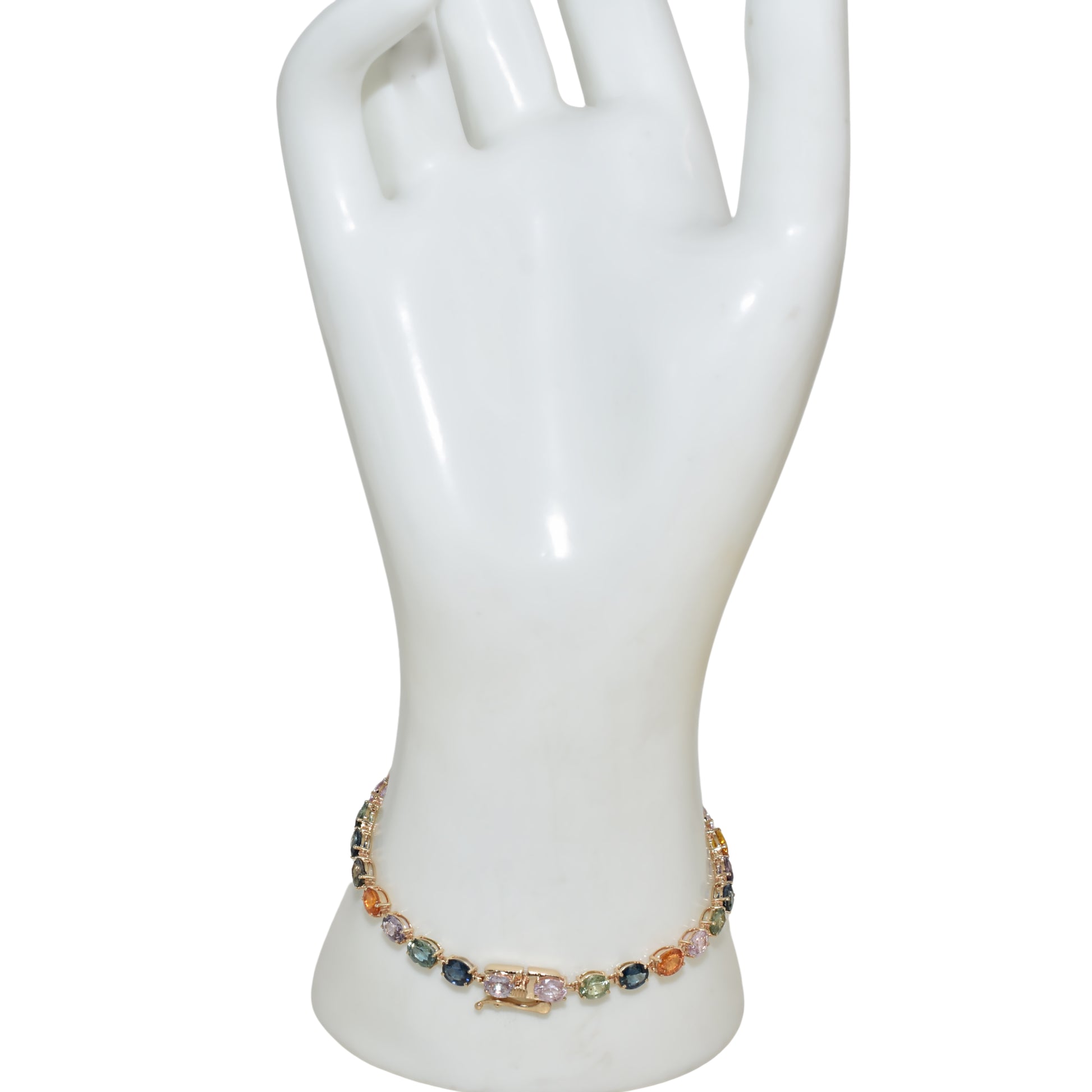 Elevate your elegance with this 14k Multi Sapphire Tennis Bracelet, showcasing a stunning array of vibrant sapphires set in lustrous 14k gold. Designed for both daily wear and special occasions, it offers timeless sophistication and a splash of color that effortlessly complements any outfit. Lightweight yet durable, this bracelet adds a refined sparkle to your wrist, making it a perfect gift or a captivating addition to your jewelry collection.