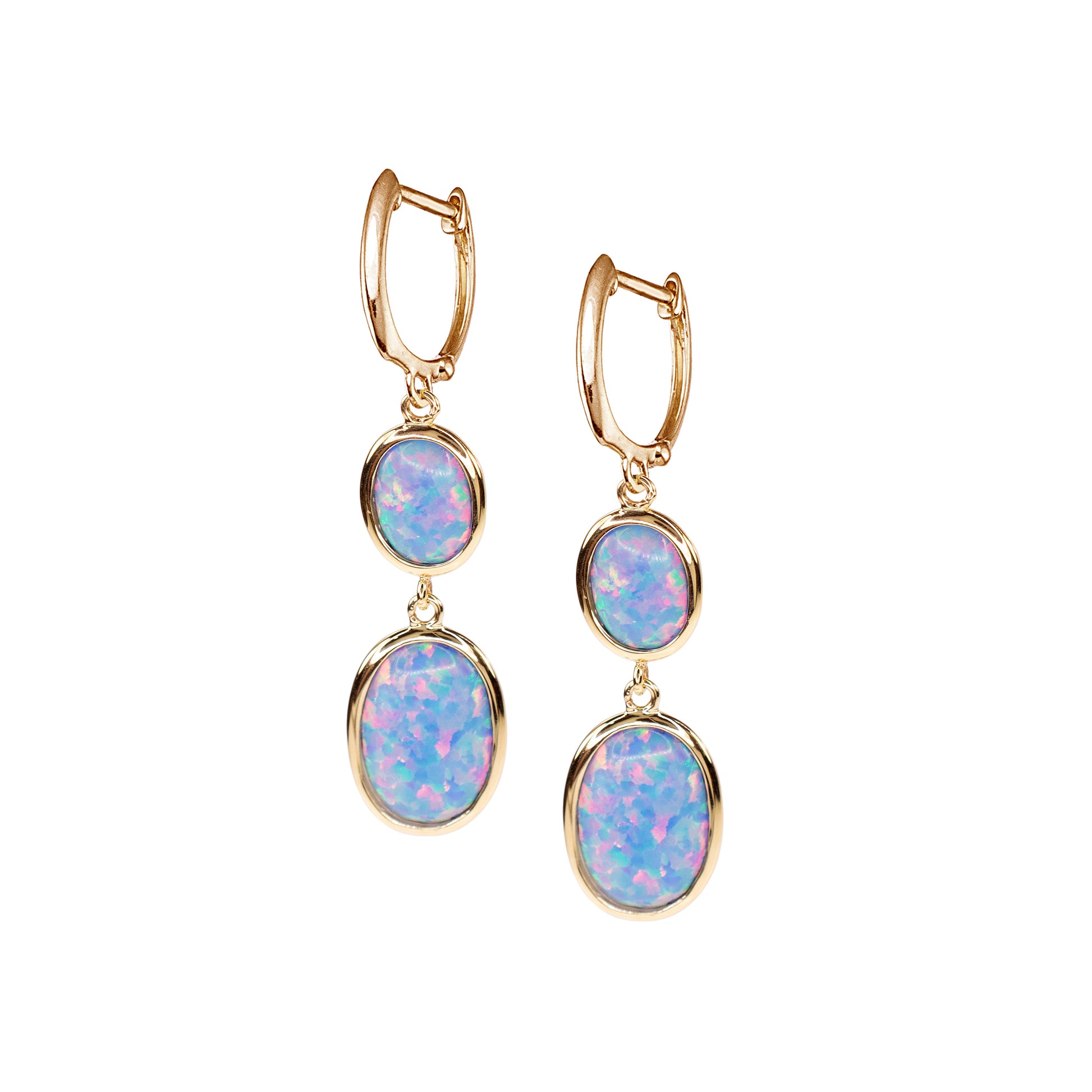 14KY LAB CREATED OPAL DUAL OVAL BEZEL HOOP EARRING (BLUE)