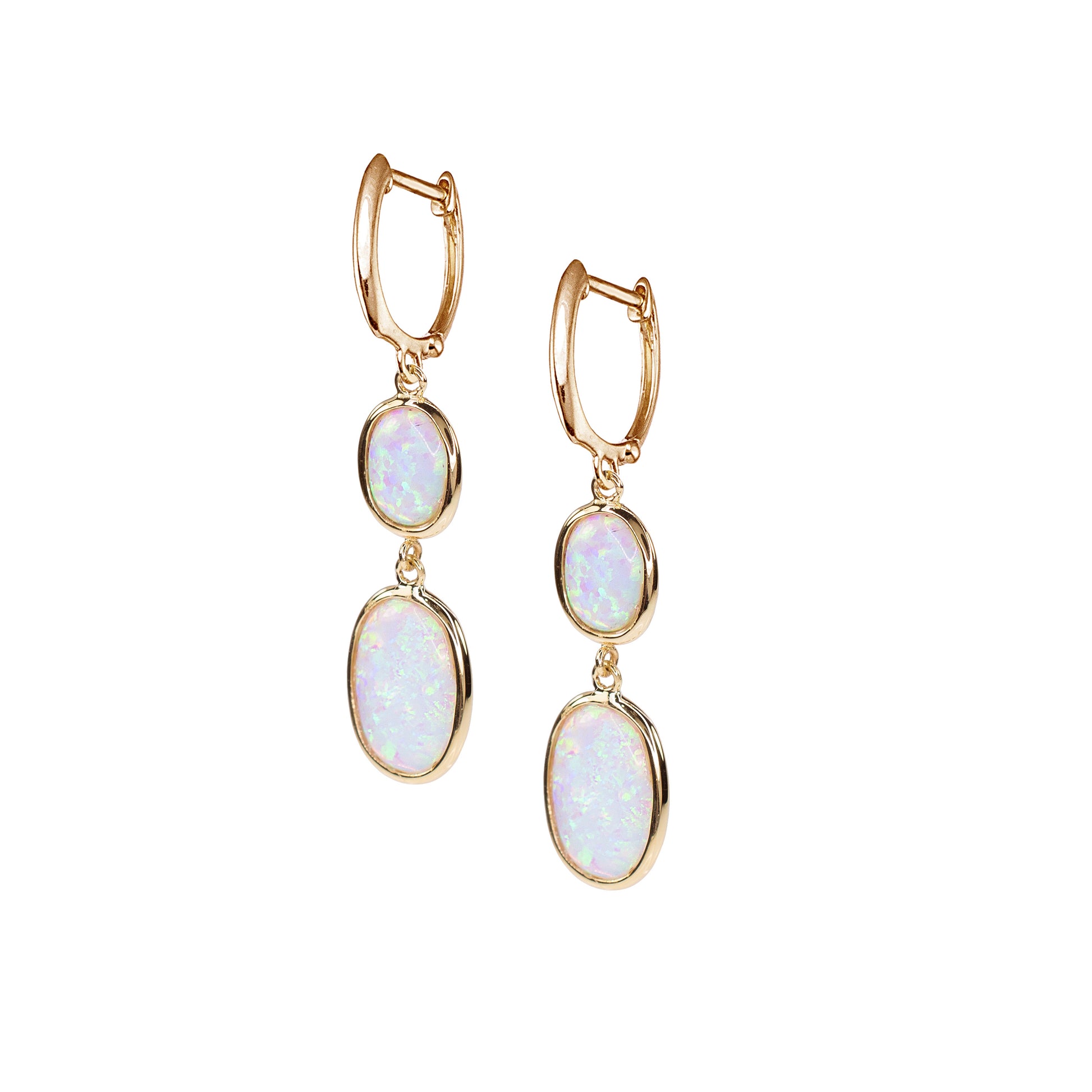 14KY LAB CREATED OPAL DUAL OVAL BEZEL HOOP EARRING (WHITE)