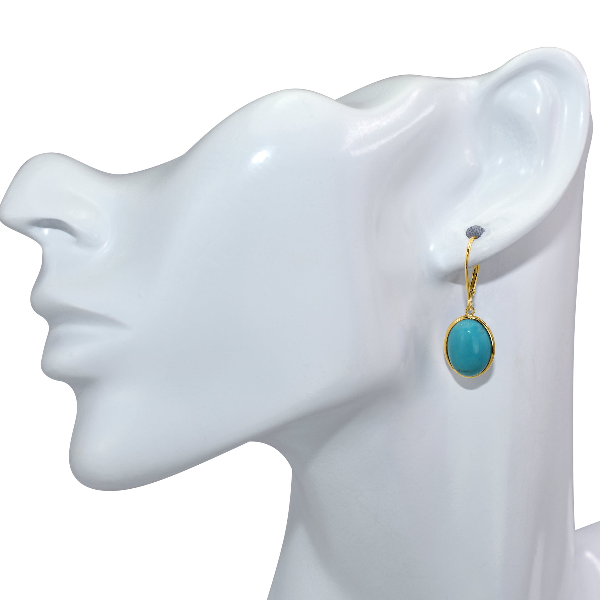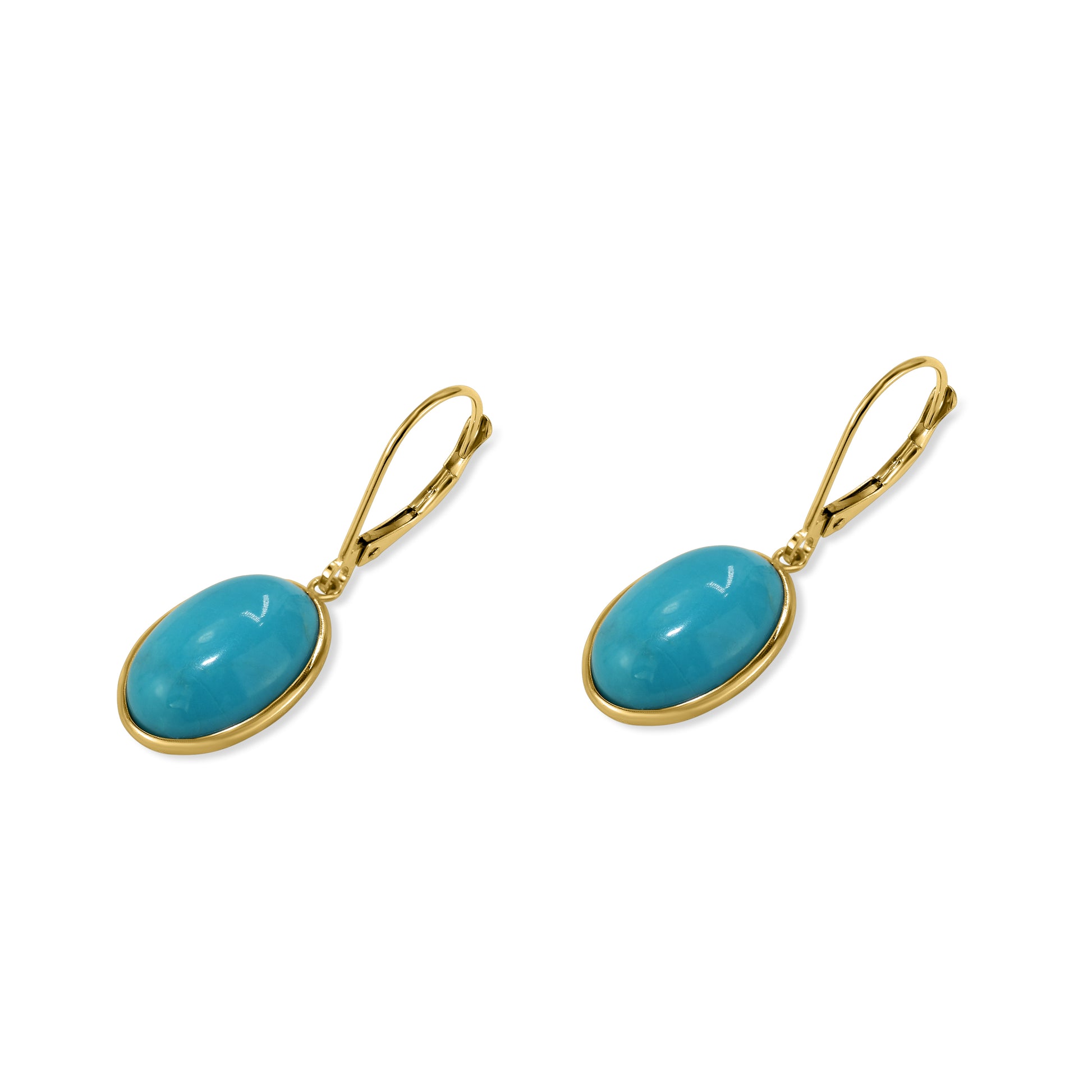 Expertly crafted with 14kt yellow gold and a beautiful oval turquoise stone, these earrings are secured with a leverback closure for added ease and comfort. Elevate any outfit with the vibrant pop of color and sophisticated style of these bezel-set earrings.