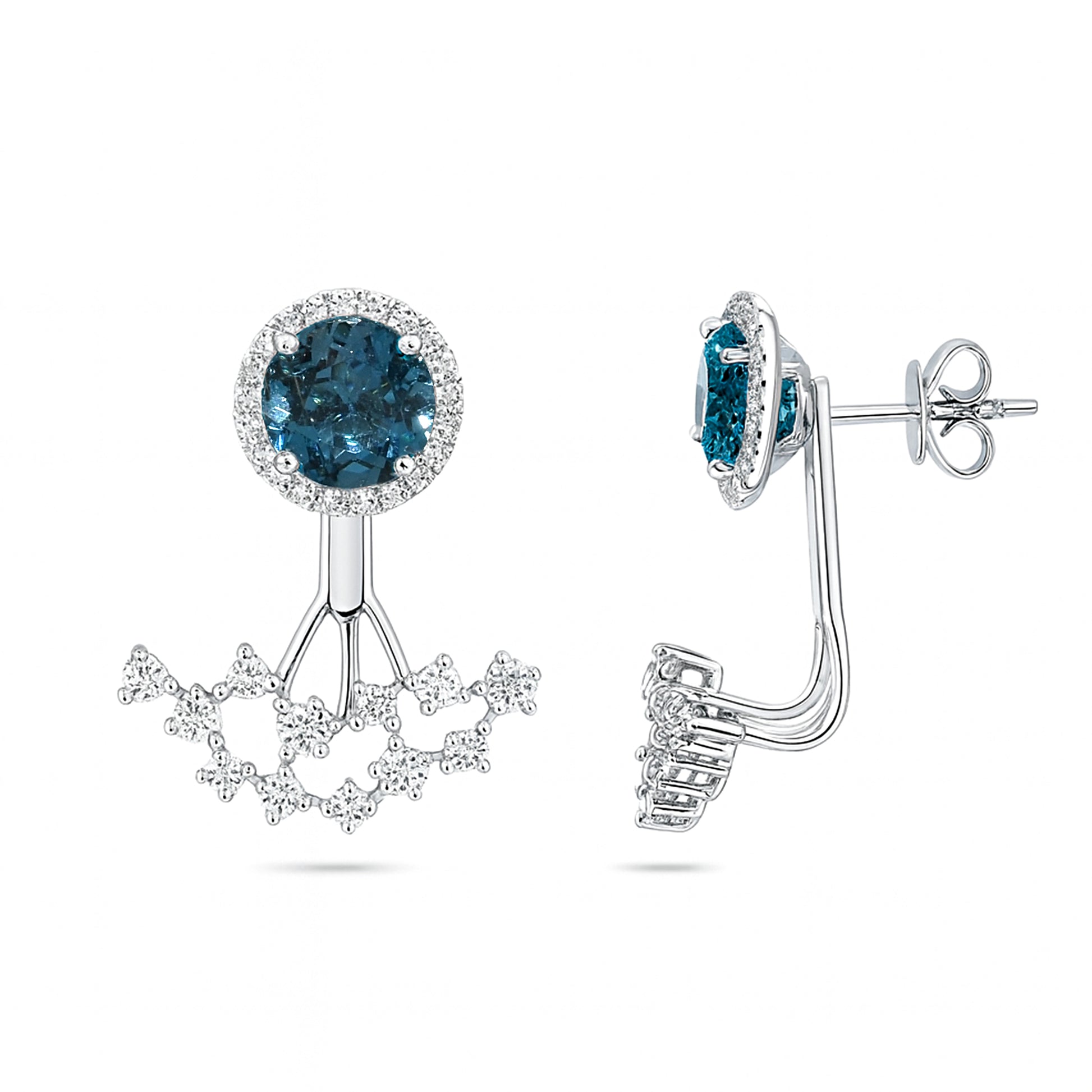 Elevate your elegance with these 14k white gold earrings featuring stunning London Blue Topaz gemstones. The unique jacket design offers versatility, allowing you to wear the front and back pieces together for a bold statement or separately for a subtle shimmer. Accented with sparkling diamonds, these earrings bring timeless sophistication and a touch of luxury to any ensemble. Perfect for special occasions or everyday glamour, they add a captivating depth and brilliance to your look.