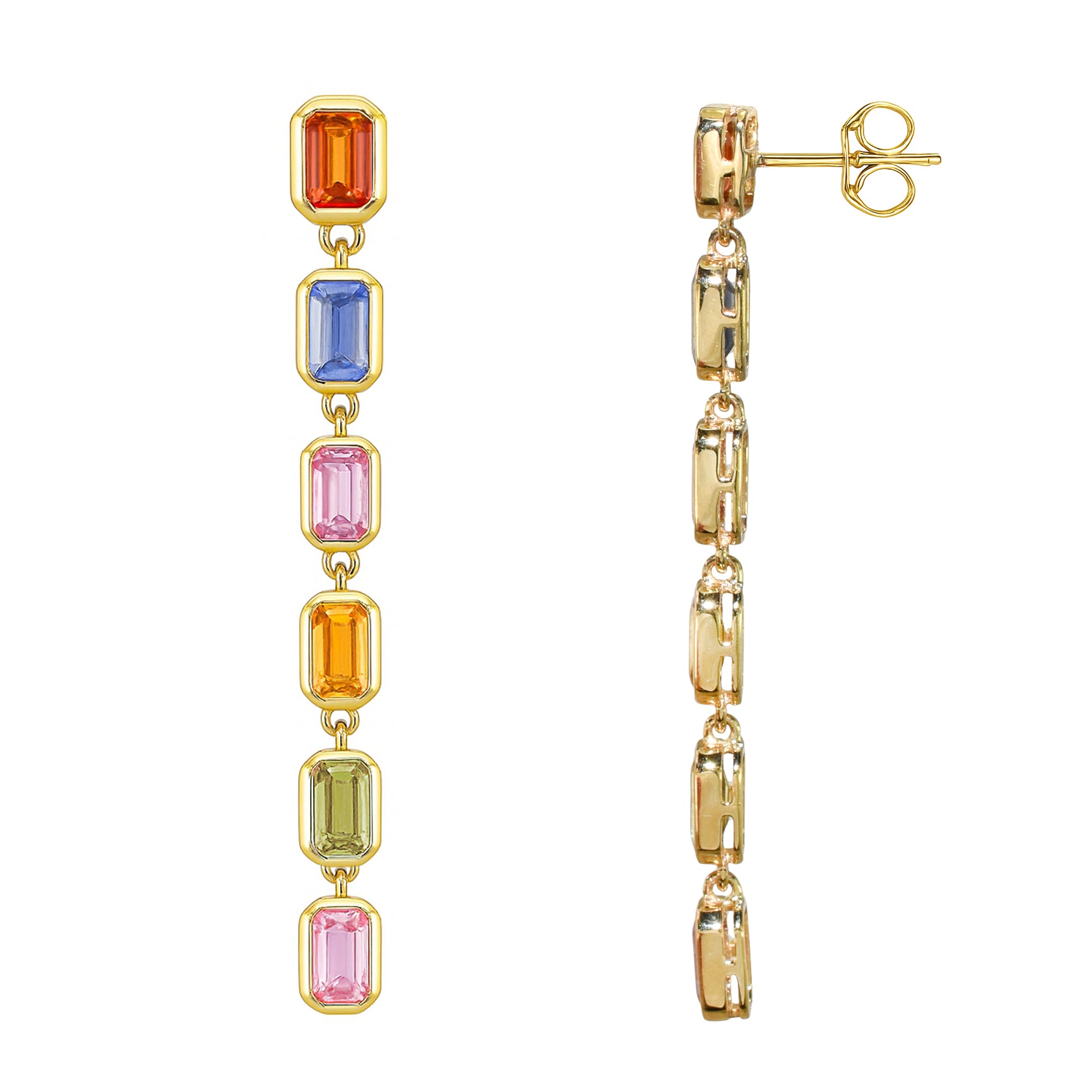 Elevate your style with these 14k gold earrings featuring a stunning rectangle design adorned with multi-colored sapphires. Each earring captures light beautifully, adding vibrant color and sophisticated charm to any outfit. Perfect for both daily wear and special occasions, these earrings offer a timeless look that enhances your elegance effortlessly.
