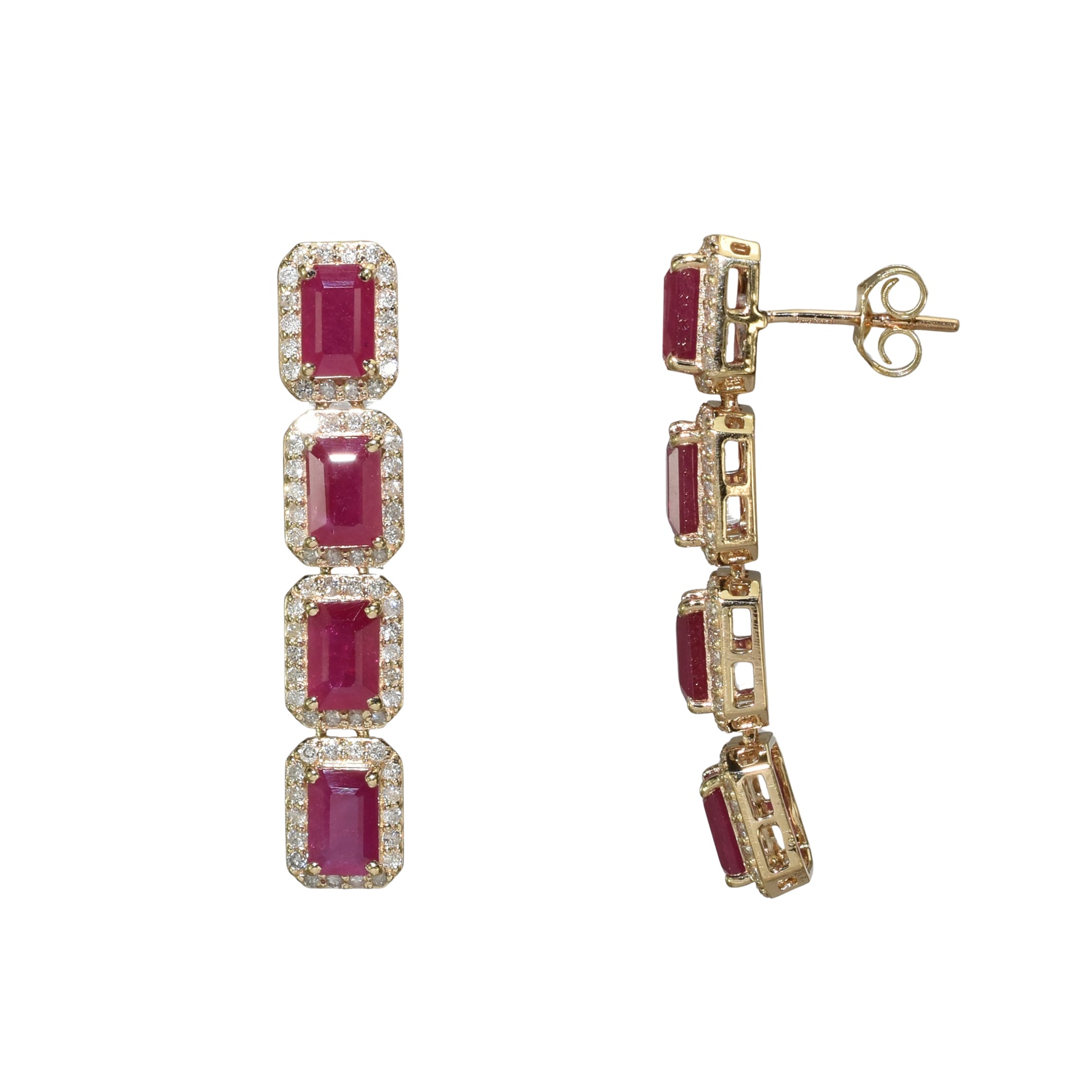 Elevate your elegance with these 14k gold earrings, featuring stunning emerald-cut rubies accented by brilliant diamonds. Designed to catch the light beautifully, they add a touch of timeless sophistication to any outfit. Perfect for special occasions or everyday luxury, these earrings combine classic style with vibrant color to make a memorable statement.
