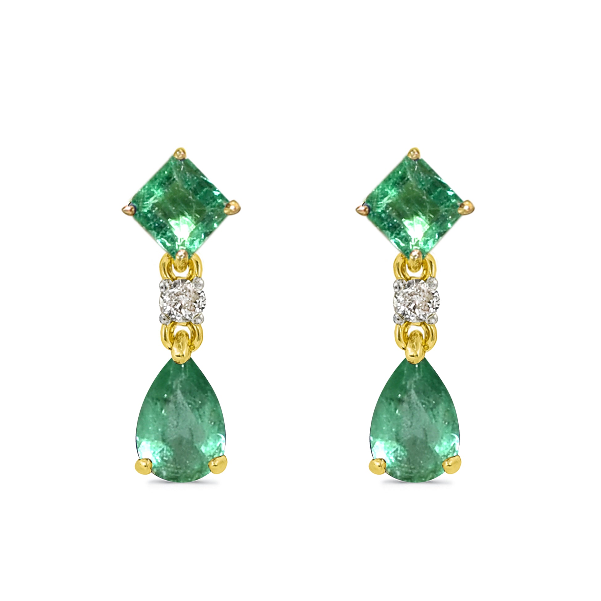 Elevate your jewelry collection with these stunning 14k gold drop earrings, featuring a captivating blend of emerald and diamond stones. The sophisticated design combines a geometric square emerald with a graceful pear-shaped diamond, creating an eye-catching contrast that works beautifully for both everyday elegance and special occasions. Crafted in premium 14k gold, these earrings offer timeless appeal with a modern twist. The rich green of the emerald pairs perfectly with the brilliant sparkle of diamonds, making these pieces a versatile addition to any wardrobe. Perfect for those who appreciate fine jewelry with distinctive character and refined taste.