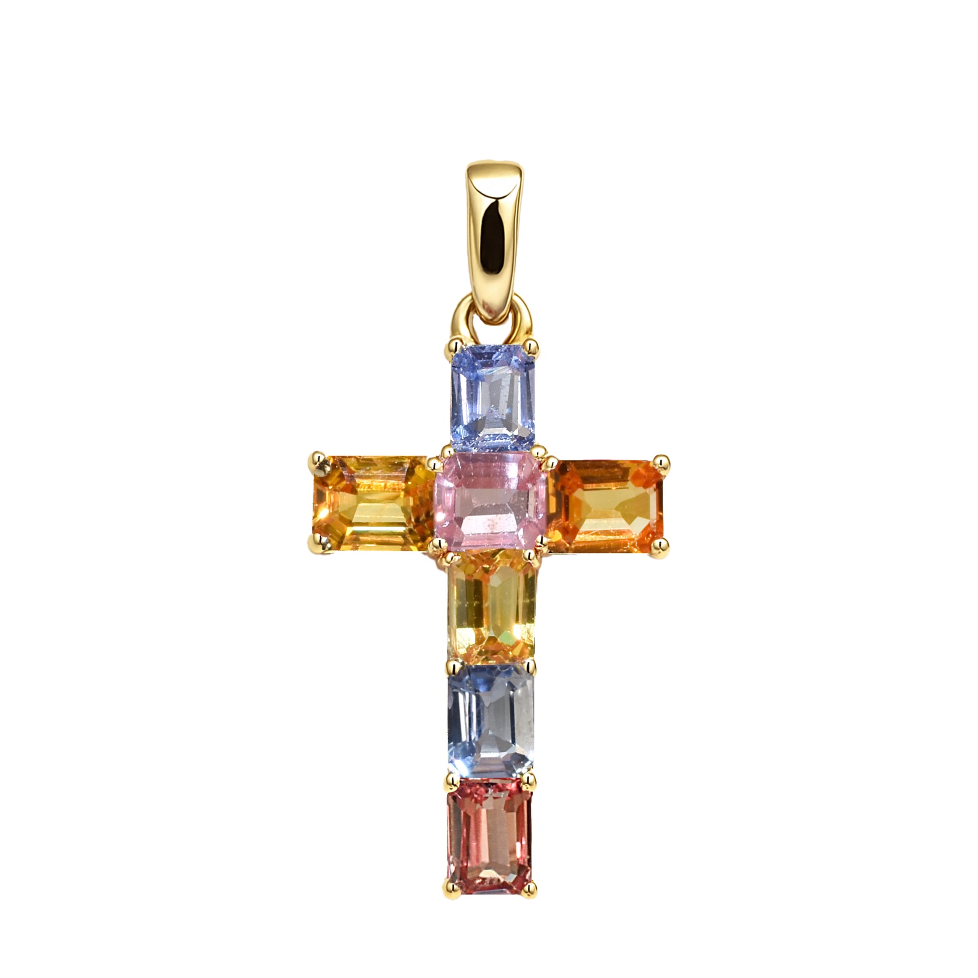 This elegant 14k gold cross pendant showcases a stunning arrangement of multi-colored sapphires that catch the light beautifully. Each sapphire is carefully selected and set to create a sophisticated, eye-catching design that works as both a meaningful spiritual symbol and a luxurious fashion statement. The 14k gold setting ensures durability and lasting brilliance, making this piece perfect for everyday wear or special occasions. Whether you're drawn to its spiritual significance or its timeless beauty, this cross pendant is a versatile addition to any jewelry collection that speaks to both faith and refined taste.