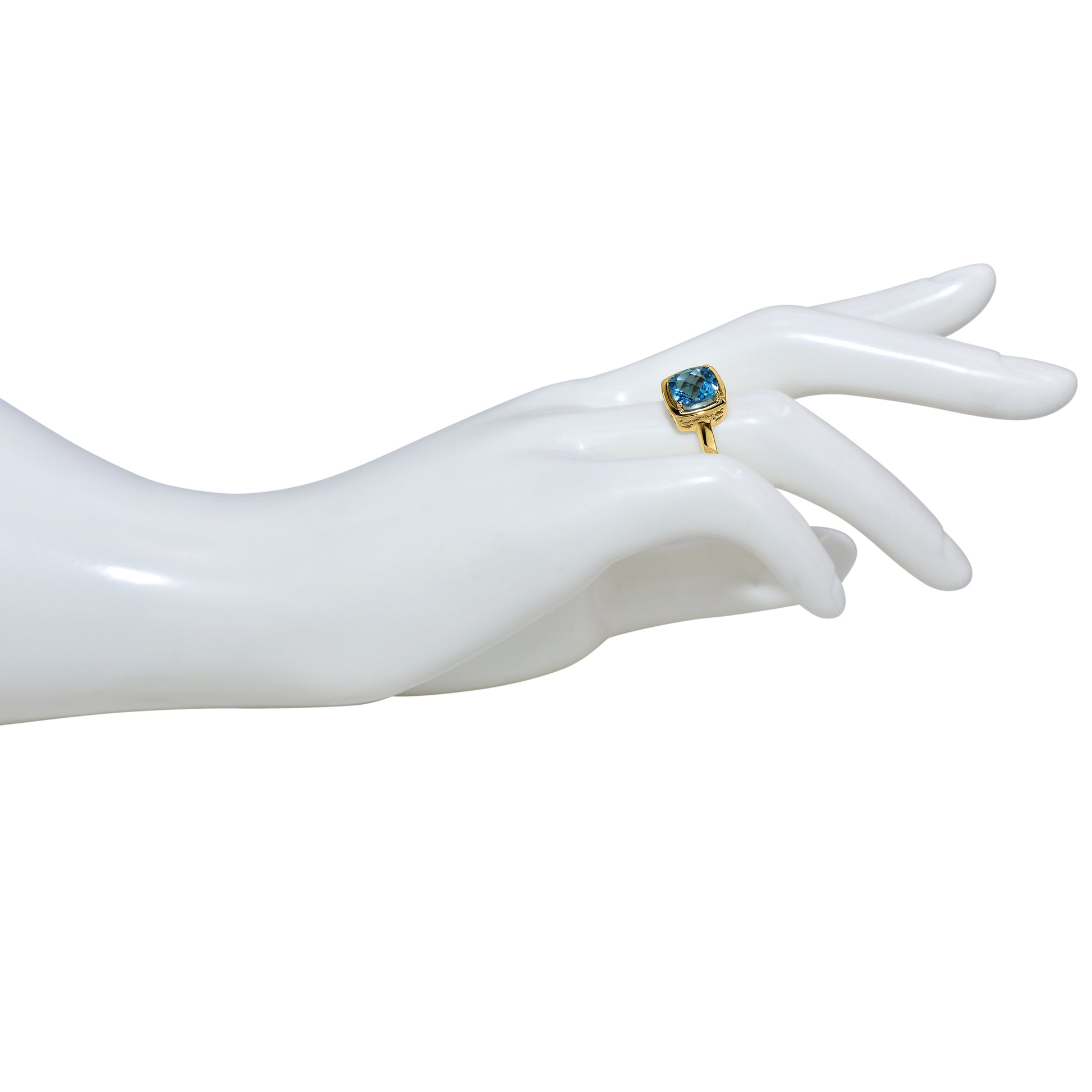 Indulge in the elegant beauty of this exquisite 14K yellow gold ring featuring a stunning Swiss blue topaz cushion cut gemstone. The perfect accessory for any occasion, this ring adds an exclusive touch of sophistication and luxury to your look. Elevate your style with this breathtaking piece.