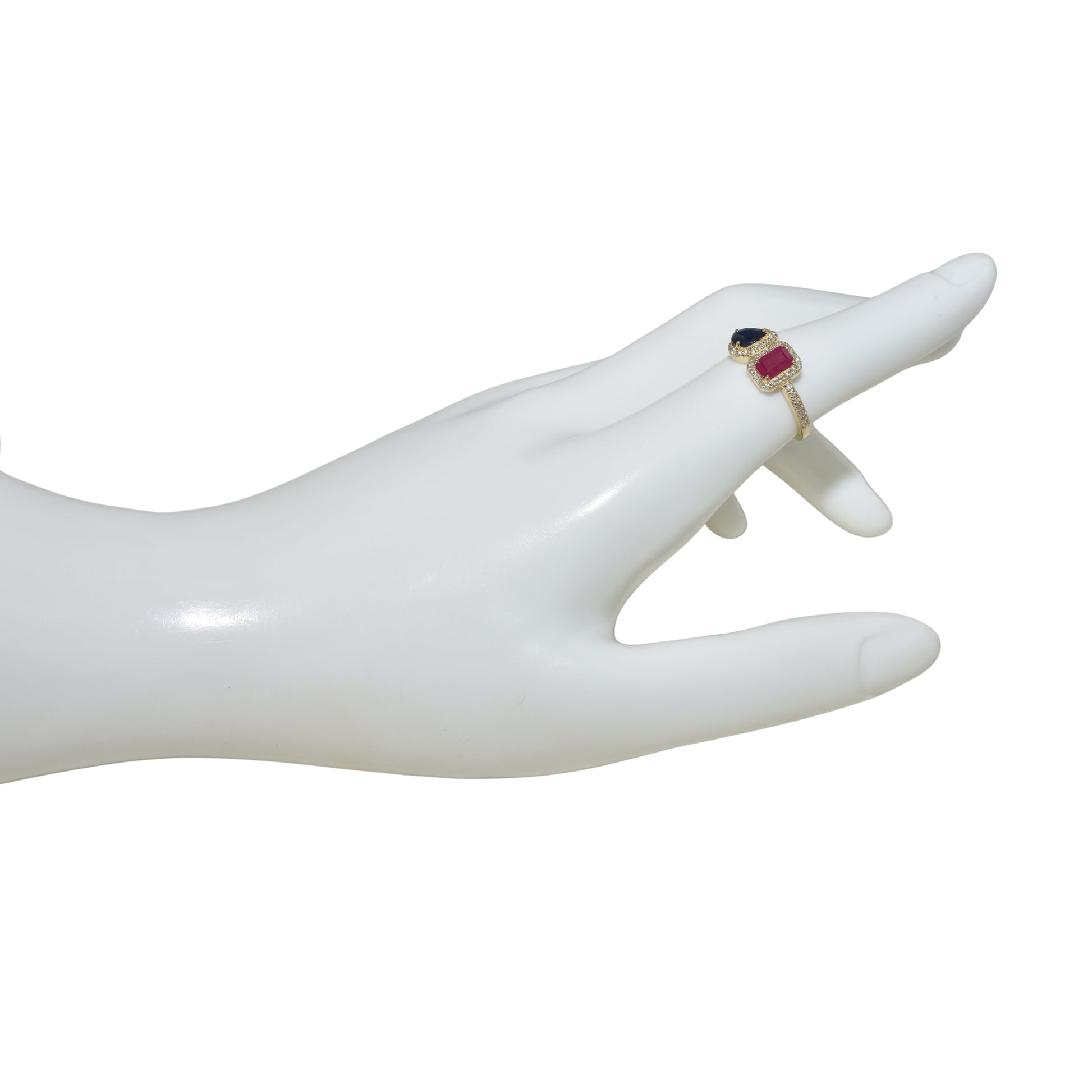 Elevate your elegance with this 14k gold ring featuring a stunning pear-shaped ruby, sapphire, and sparkling diamonds set alongside a sleek rectangular design. This unique combination creates a captivating contrast, making it perfect for those who appreciate bold, timeless beauty. Wear it to add a sophisticated touch to any outfit and let your style shine with every gesture.