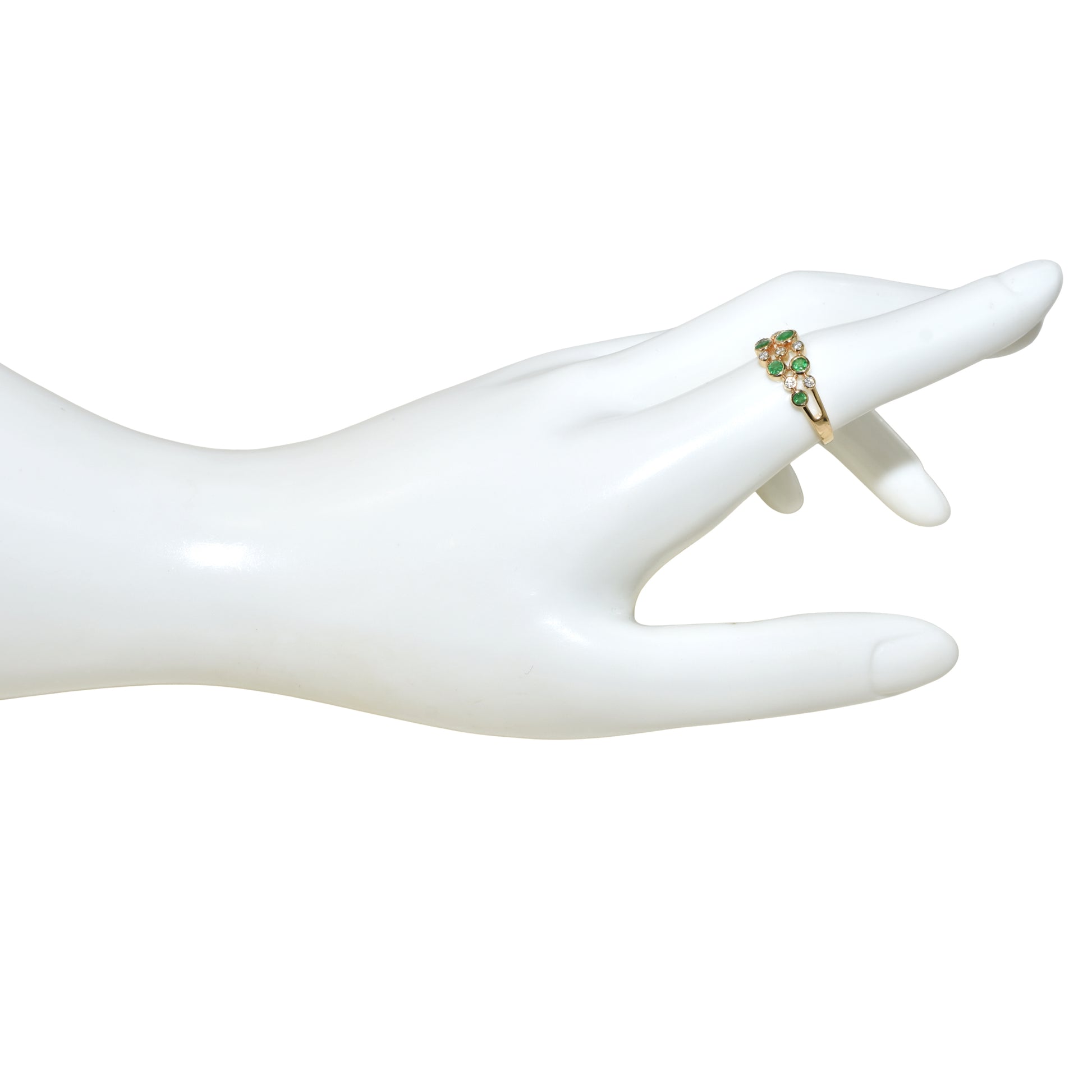 Elevate your elegance with this 14k gold ring featuring a mesmerizing arrangement of emerald and diamond circles. The rich green emeralds contrast beautifully with sparkling diamonds, creating a captivating design that highlights your unique style. Perfect for special occasions or everyday sophistication, this ring adds a touch of timeless luxury to any look.