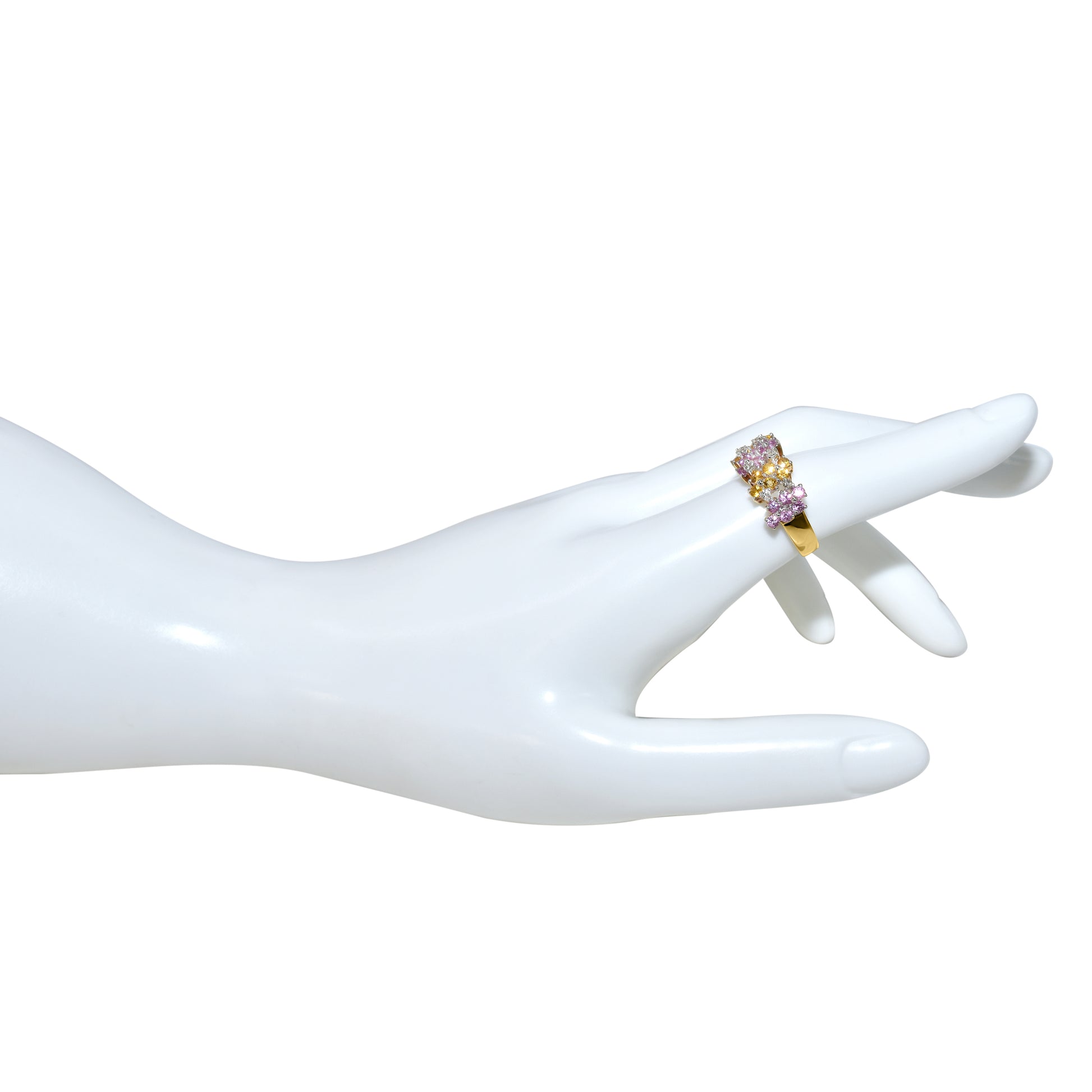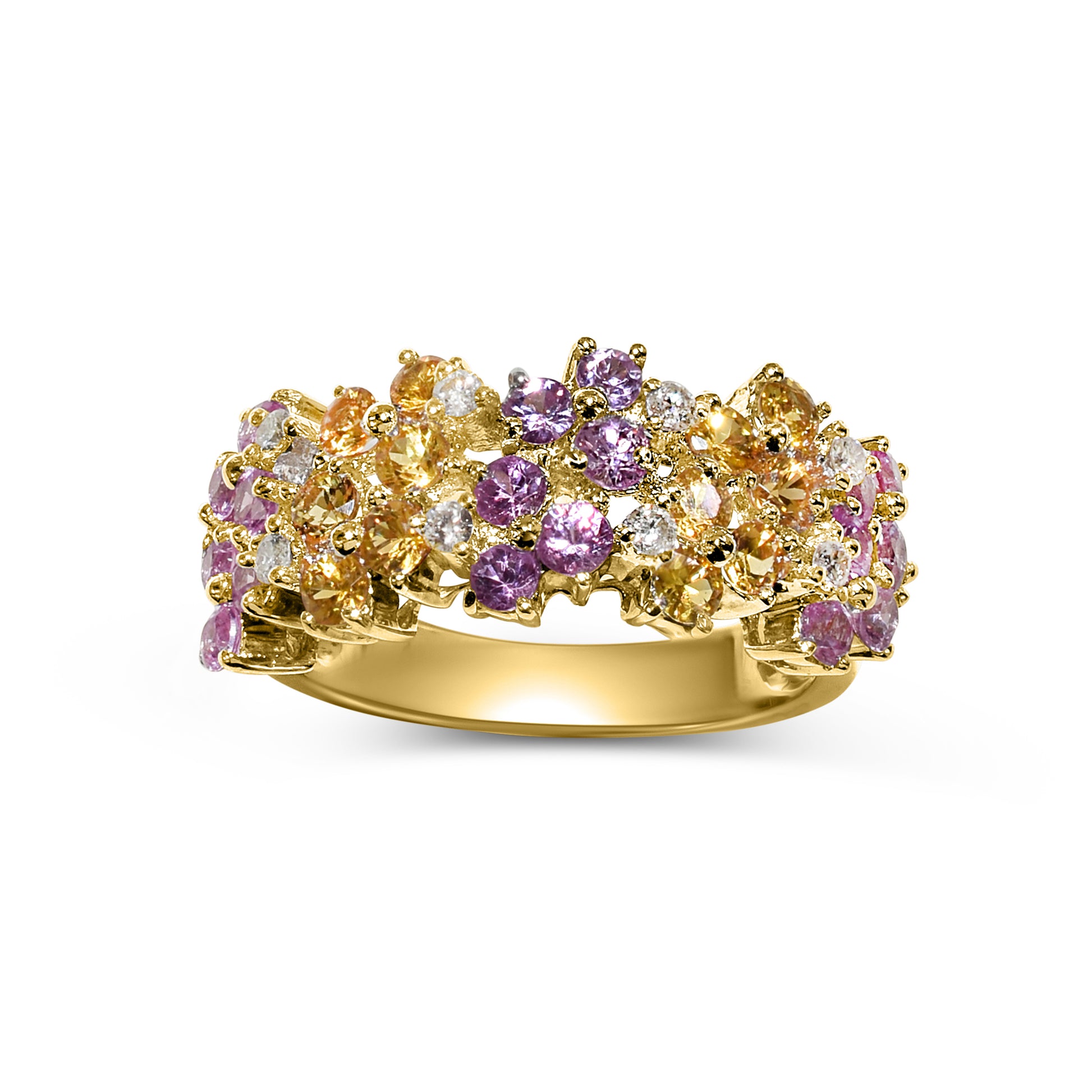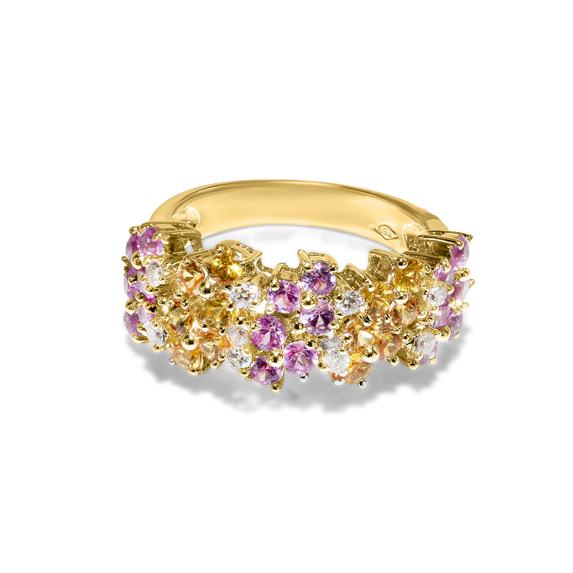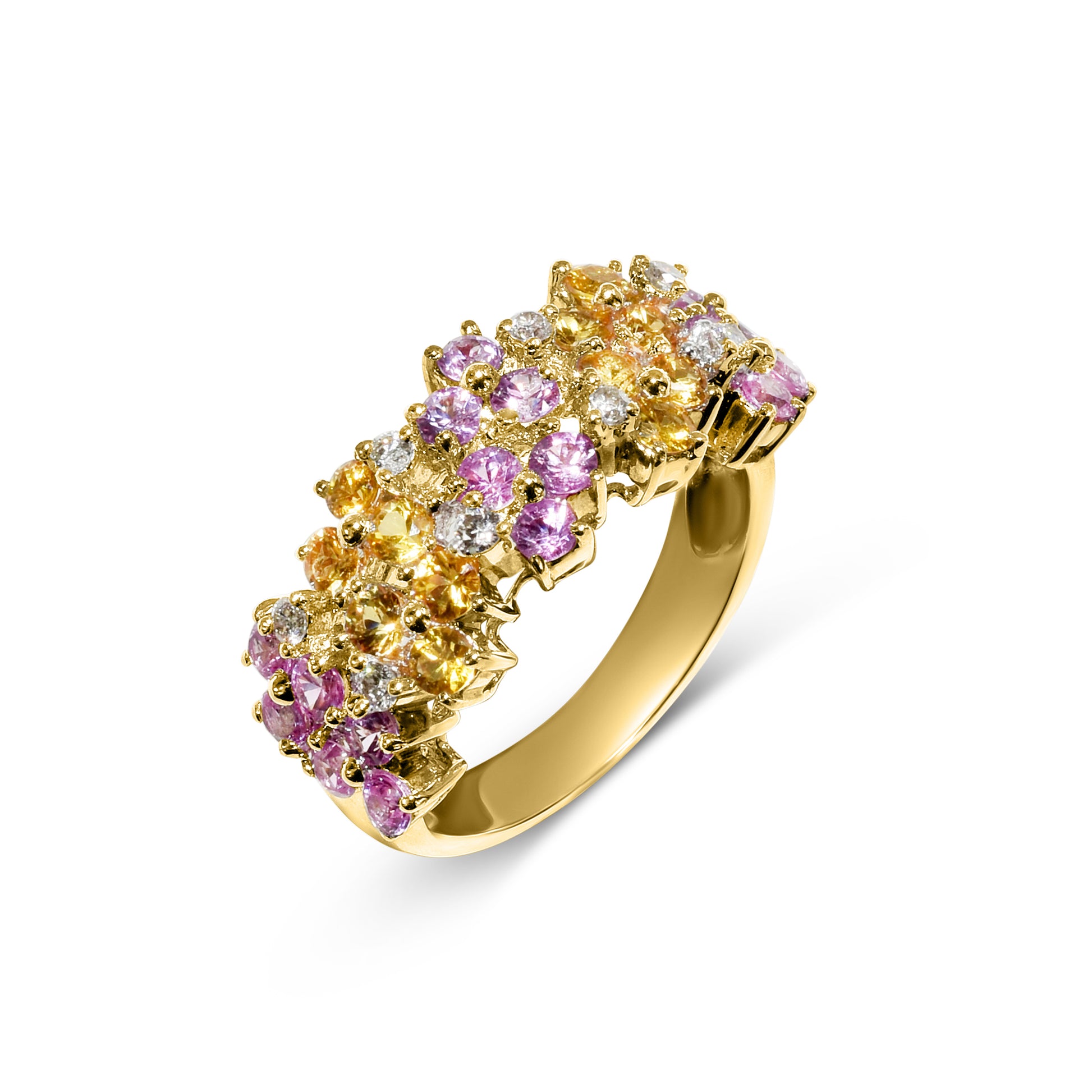 This 18k pink and yellow sapphire diamond ring offers a stunning blend of vibrant colors and timeless elegance. Crafted in high-quality 18k gold, it showcases vivid pink and yellow sapphires complemented by sparkling diamonds. Perfect for making a bold statement, this ring brings a unique touch of luxury and sophistication to any outfit. Elevate your jewelry collection with a piece that captures both beauty and brilliance.