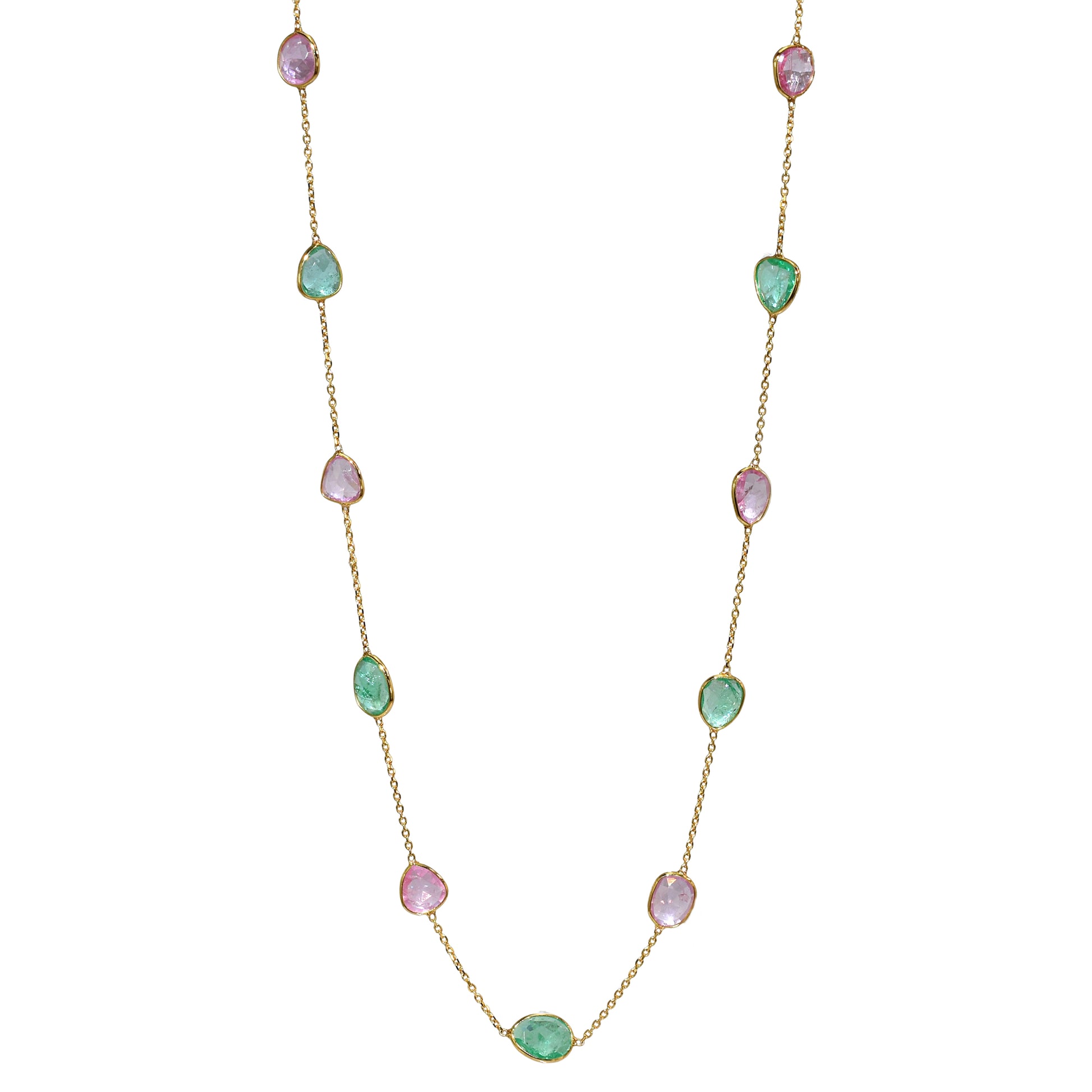 This exquisite 18k gold necklace showcases a stunning blend of emerald and pink sapphires in a variety of captivating shapes. Perfect for adding a splash of vibrant color and elegance to any outfit, it effortlessly enhances your style with its unique, luxurious design. Whether for special occasions or daily wear, this necklace is a timeless statement piece that highlights your refined taste and elevates your jewelry collection.