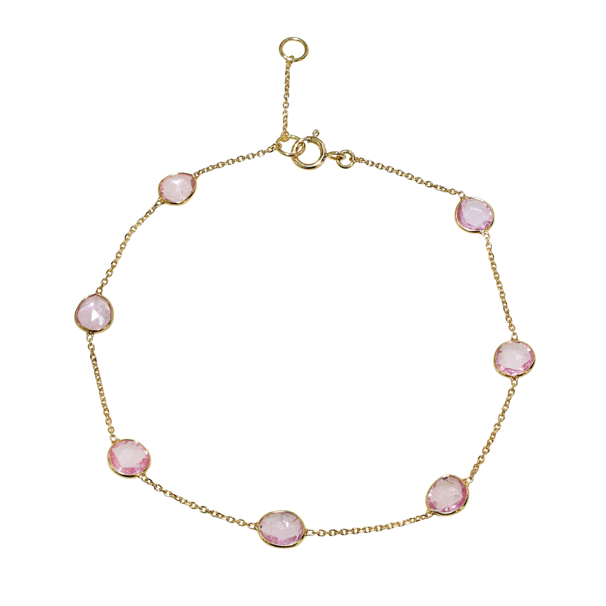 Elevate your elegance with the 18k Pink Sapphire Circle Bezel Bracelet. Crafted from luxurious 18k gold, this delicate bracelet features a vibrant pink sapphire encased in a sleek circle bezel. Its timeless design adds a touch of sophistication to any outfit, making it perfect for both everyday wear and special occasions. Experience lasting beauty and subtle glamour with this exquisite accessory that complements your unique style effortlessly.