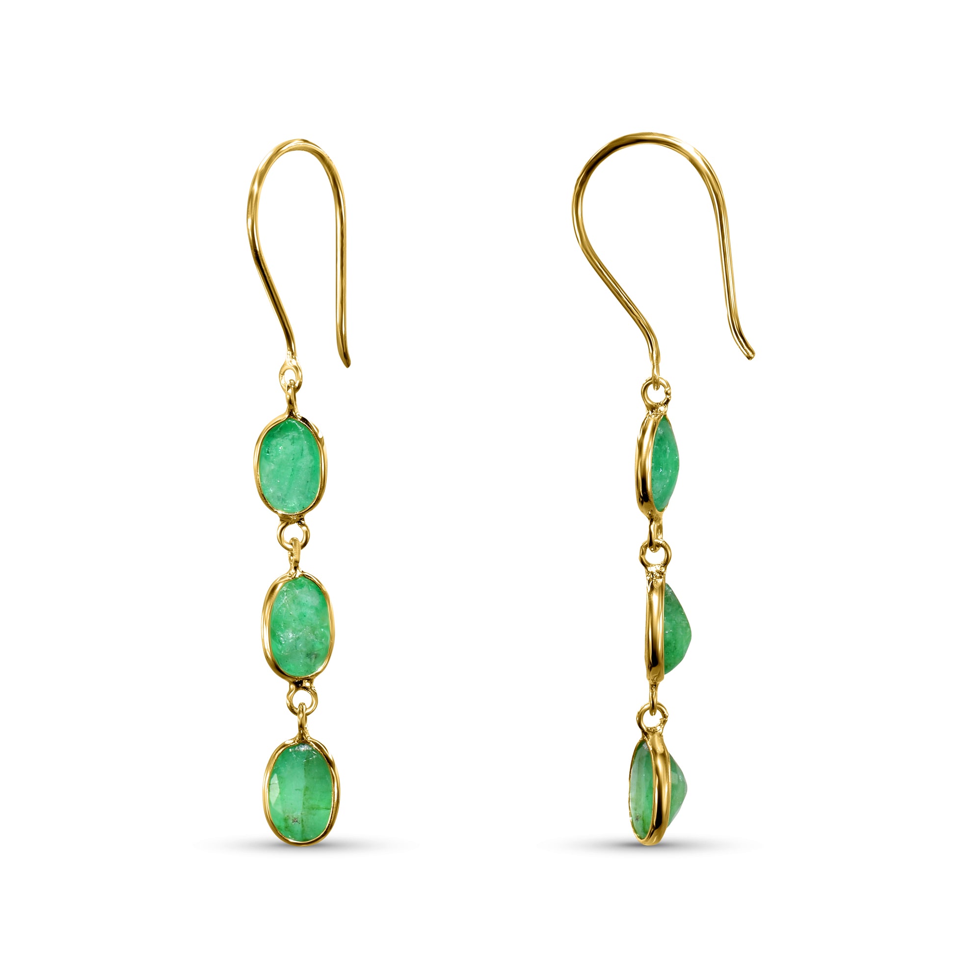 Elevate your elegance with these 18k gold oval-shaped dangle earrings, featuring vibrant emeralds that catch the light with every movement. Their timeless design adds a touch of sophistication to any outfit, making them perfect for both special occasions and everyday luxury. Experience the allure of fine craftsmanship combined with the rich green glow of emeralds, designed to enhance your natural beauty and confidence.