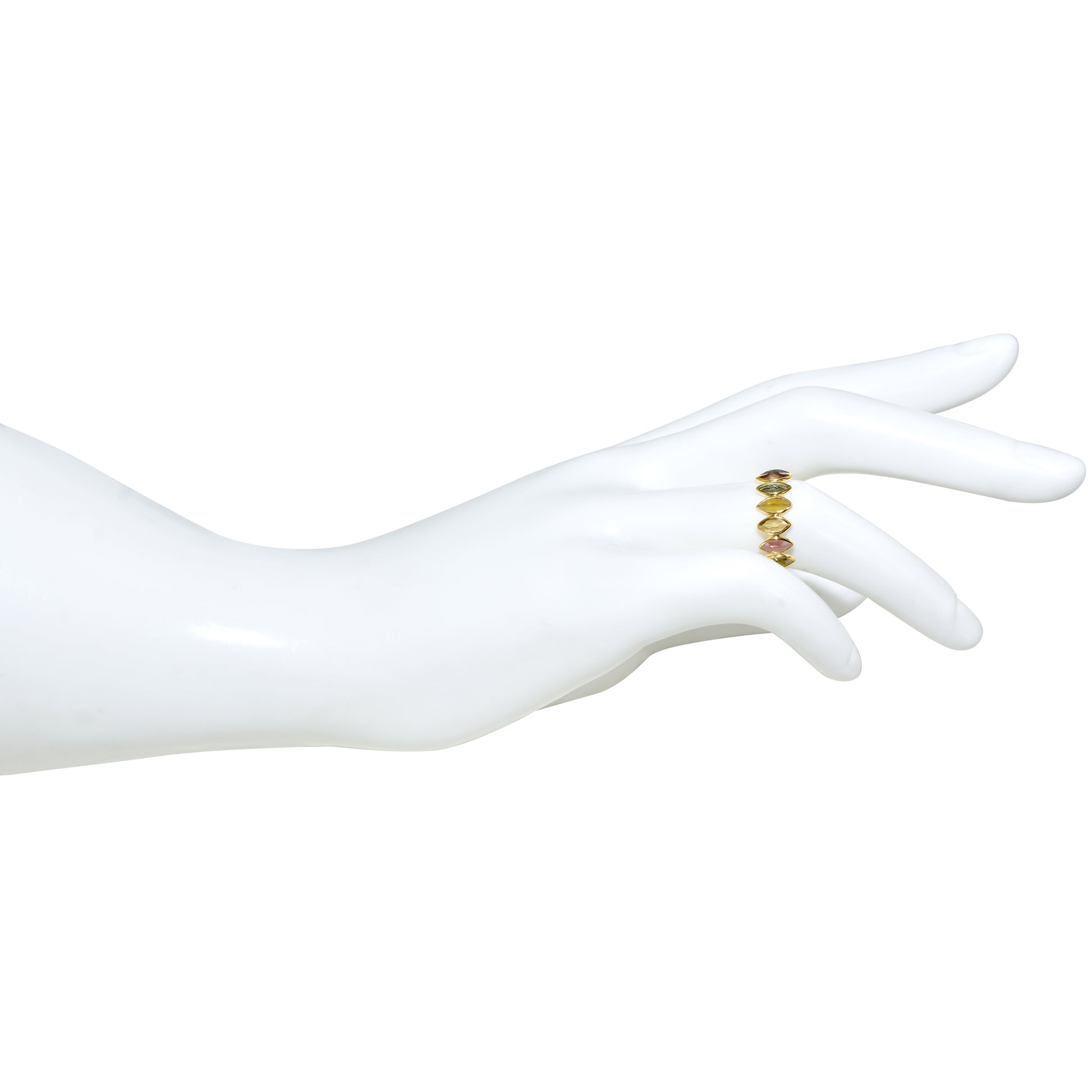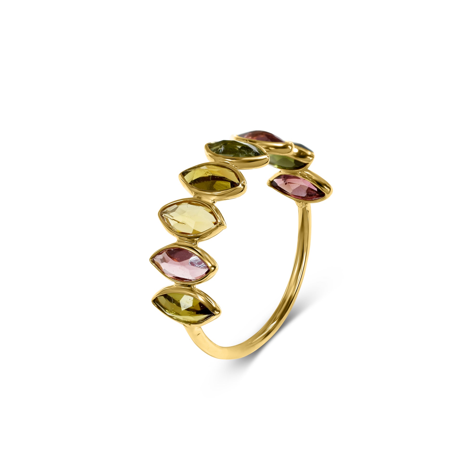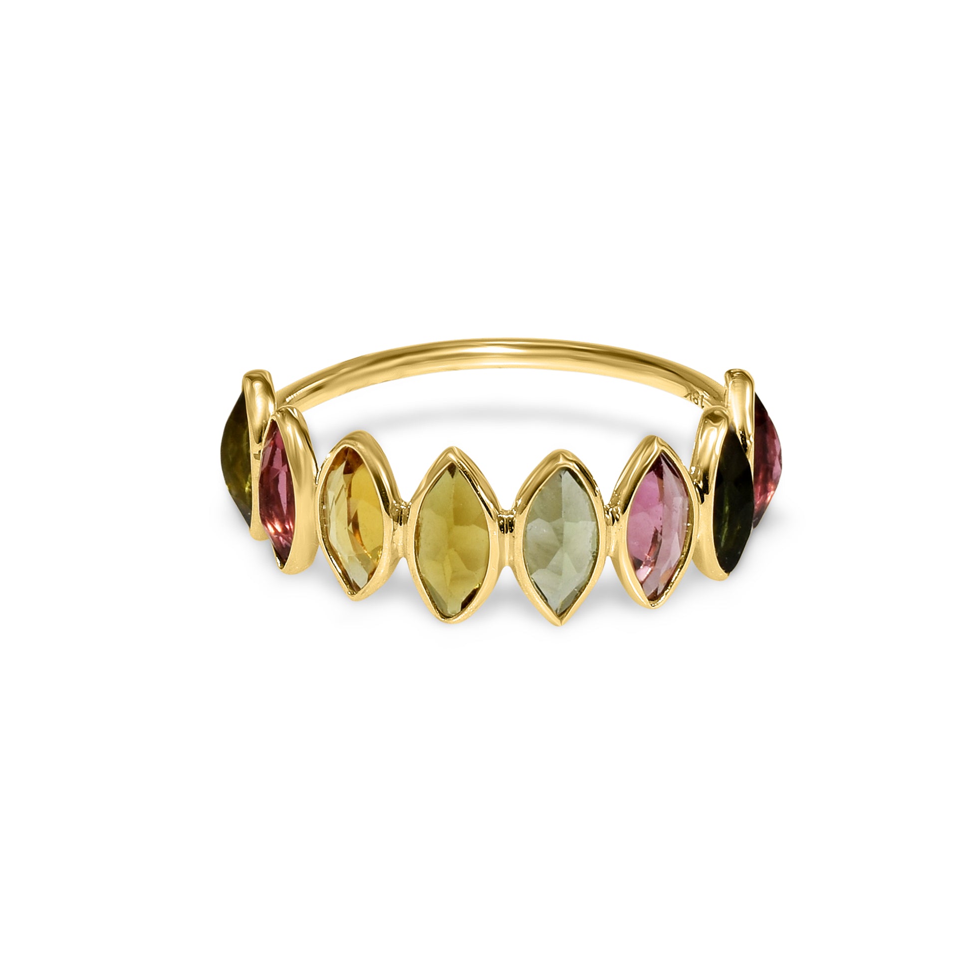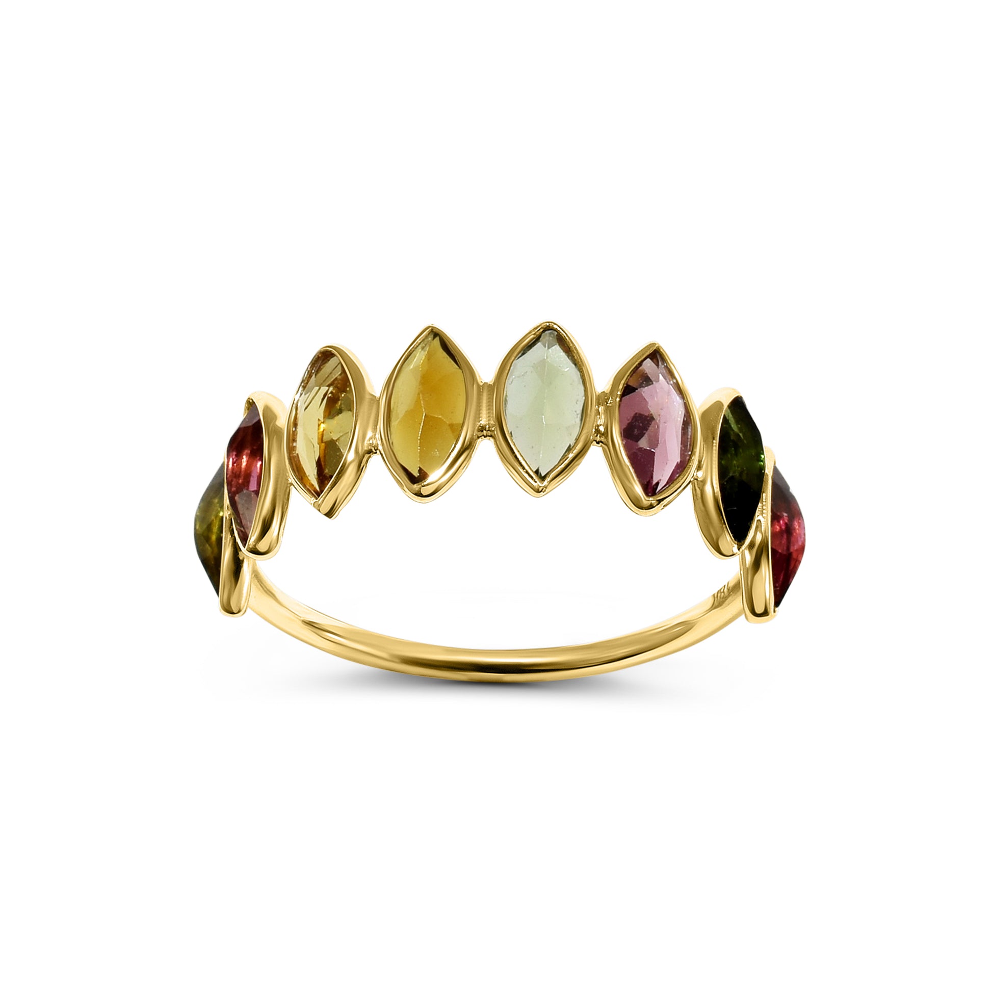 Elevate your style with our stunning 18k Tourmaline Marquise One Row Ring. This elegant piece features a row of shimmering marquise-cut tourmaline stones set in a luxurious 18k gold band. Get ready to turn heads and make a statement with this unique and eye-catching ring. A must-have addition to any jewelry collection.