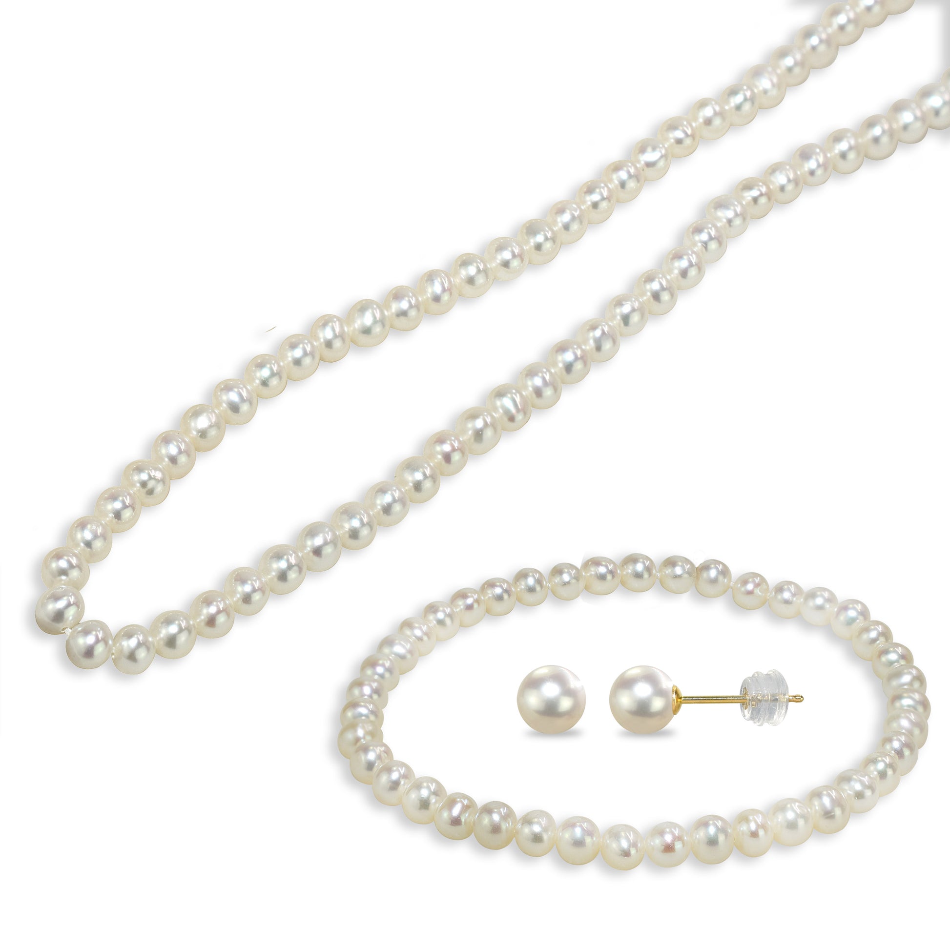 Experience timeless elegance with our 14k White Freshwater Pearl Strand Set. This necklace, earrings and bracelet set includes an 18-inch strand of lustrous pearls, each hand-selected for its quality and luster. The spring ring clasp ensures easy and secure wear, making this set a must-have addition to your jewelry collection.
