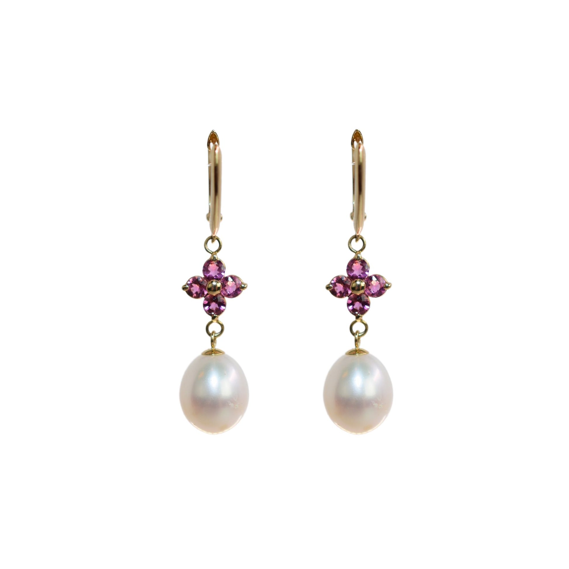 14k Pink Tourmaline Flower And White Freshwater Pearl Drop Earring