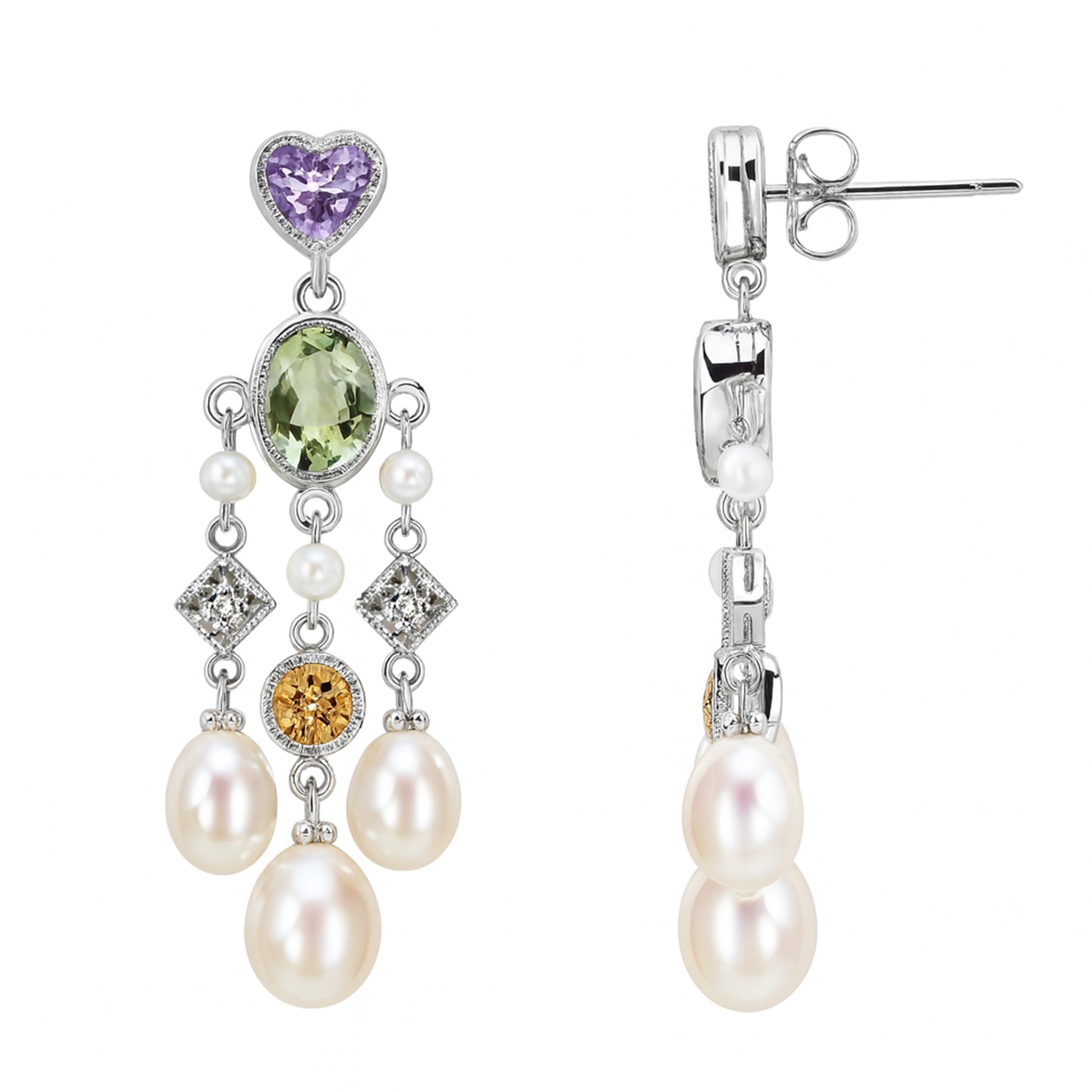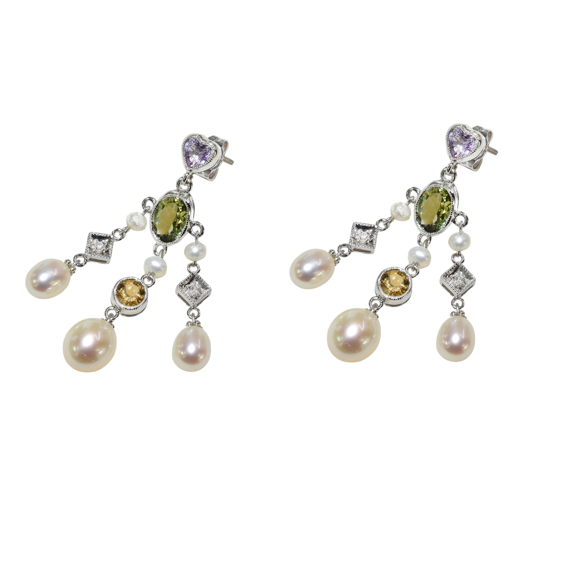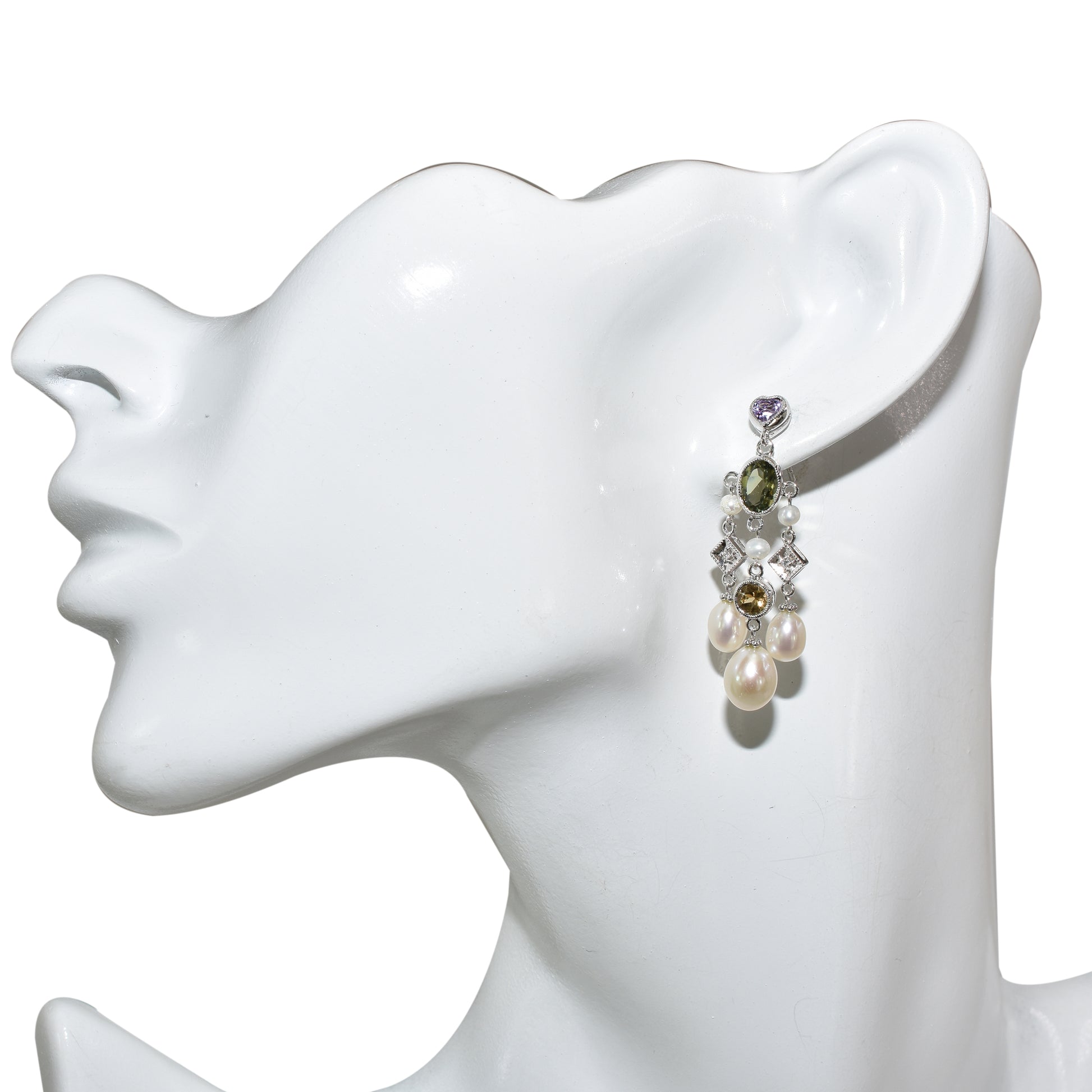 Elevate your elegance with these 14k white gold earrings, featuring vibrant green tourmalines accented by sparkling diamonds and lustrous freshwater pearls. The exquisite combination offers a timeless look that enhances any outfit, perfect for special occasions or everyday luxury. Experience the subtle brilliance and unique charm that these earrings bring to your jewelry collection.