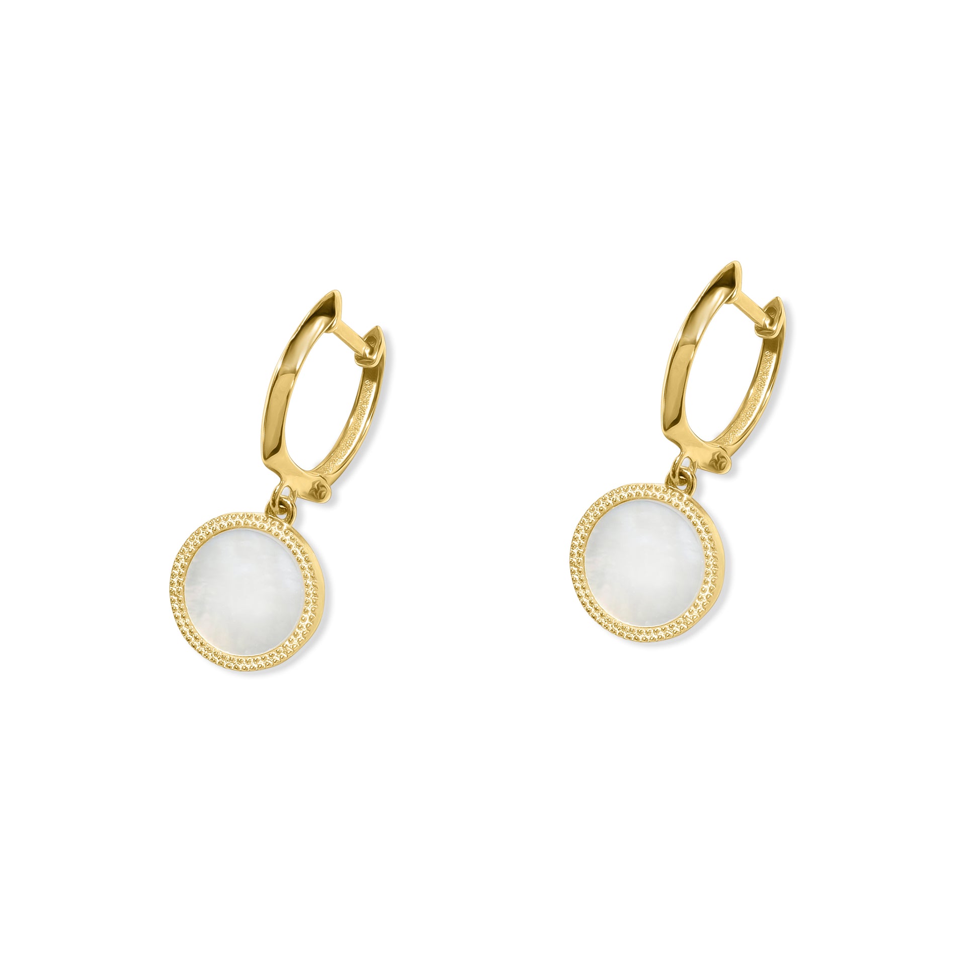 Elevate your style with these 14k gold round hoop earrings, accented by delicate mother of pearl beads. Their timeless design adds a touch of elegance to any outfit, making them perfect for both everyday wear and special occasions. Lightweight and comfortable, these earrings effortlessly enhance your look with subtle shimmer and refined charm. A versatile accessory that brings sophistication to your jewelry collection.