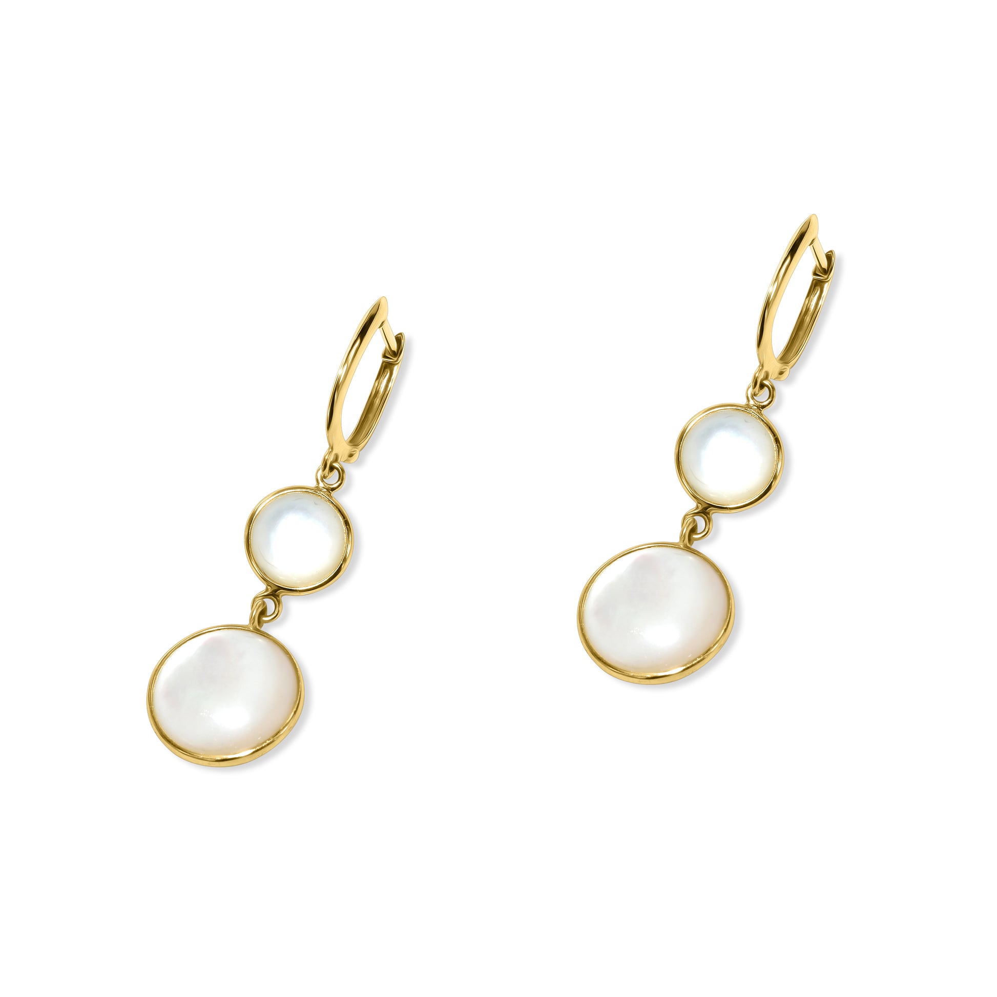 Elevate your elegance with these 14k gold hoop earrings, featuring a lustrous mother of pearl round bezel that gracefully dangles with every movement. Perfectly balancing timeless sophistication and modern style, they add a subtle shimmer to any outfit. Lightweight and crafted with care, these earrings are designed to complement your look from day to night effortlessly.